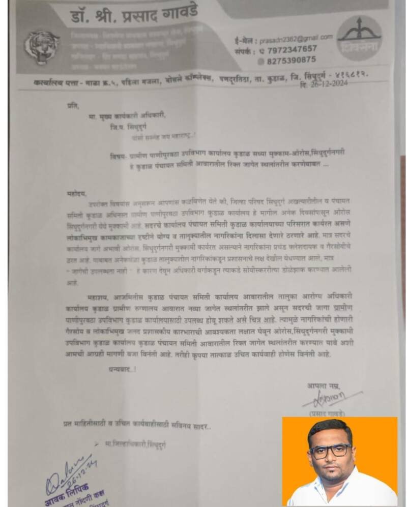 тАЬ рдЬрд╛рдЧреЗрдЪреА рдЙрдкрд▓рдмреНрдзрддрд╛ рдирд╛рд╣реА тАЭ рд╣реЗ рдХрд╛рд░рдг рджреЗрд╡реВрди рдЕрдзрд┐рдХрд╛рд░реА рд╡рд░реНрдЧрд╛рдХрдбреВрди рддреНрдпрд╛рдХрдбреЗ рд╕реЛрдпреАрд╕реНрдХрд░рд░реАрддреНрдпрд╛ рдбреЛрд│реЗрдЭрд╛рдХ рдХрд░рдгреНрдпрд╛рдд рдЖрд▓реЗрд▓реА рдЖрд╣реЗ. рдЖрдЬрдорд┐рддреАрд╕ рдХреБрдбрд╛рд│ рдкрдВрдЪрд╛рдпрдд рд╕рдорд┐рддреА рдХрд╛рд░реНрдпрд╛рд▓рдп рдЖрд╡рд╛рд░рд╛рддреАрд▓ рддрд╛рд▓реБрдХрд╛ рдЖрд░реЛрдЧреНрдп рдЕрдзрд┐рдХрд╛рд░реА рдХрд╛рд░реНрдпрд╛рд▓рдп рдХреБрдбрд╛рд│ рдЧреНрд░рд╛рдореАрдг рд░реБрдЧреНрдгрд╛рд▓рдп рдЖрд╡рд╛рд░рд╛рдд рдирд╡реНрдпрд╛ рдЬрд╛рдЧреЗрдд рд╕реНрдерд▓рд╛рдВрддрд░реАрдд рдЭрд╛рд▓реЗ рдЕрд╕реВрди рд╕рджрд░рдЪреА рдЬрд╛рдЧрд╛ рдЧреНрд░рд╛рдореАрдг рдкрд╛рдгреАрдкреБрд░рд╡рдард╛ рдЙрдкрд╡рд┐рднрд╛рдЧ рдХреБрдбрд╛рд│ рдХрд╛рд░реНрдпрд╛рд▓рдпрд╛рд╕рд╛рдареА рдЙрдкрд▓рдмреНрдз рд╣реЛрд╡реВ рд╢рдХрддреЗ рдЕрд╕реЗ рдЪрд┐рддреНрд░ рдЖрд╣реЗ. рддреНрдпрд╛рдореБрд│реЗ рдирд╛рдЧрд░рд┐рдХрд╛рдВрдЪреА рд╣реЛрдгрд╛рд░реА рдЧреИрд░рд╕реЛрдп рд╡ рд▓реЛрдХрд╛рднрд┐рдореБрдЦ рдЬрд▓рдж рдкреНрд░рд╢рд╛рд╕рдХреАрдп рдХрд╛рд░рднрд╛рд░рд╛рдЪреА рдЖрд╡рд╢реНрдпрдХрддрд╛ рд▓рдХреНрд╖рд╛рдд рдШреЗрд╡реВрди рдУрд░реЛрд╕,рд╕рд┐рдВрдзреБрджреБрд░реНрдЧрдирдЧрд░реА рдореБрдХреНрдХрд╛рдореА рдЙрдкрд╡рд┐рднрд╛рдЧ рдХреБрдбрд╛рд│ рдХрд╛рд░реНрдпрд╛рд▓рдп рдЖрдкрд▓реНрдпрд╛ рдХреБрдбрд╛рд│ рдкрдВрдЪрд╛рдпрдд рд╕рдорд┐рддреА рдЖрд╡рд╛рд░рд╛рддреАрд▓ рд░рд┐рдХреНрдд рдЬрд╛рдЧреЗрдд рд╕реНрдерд▓рд╛рдВрддрд░реАрдд рдХрд░рдгреНрдпрд╛рдд рдпрд╛рд╡реЗ рдЕрд╢реА рдЖрдЧреНрд░рд╣реА рдорд╛рдЧрдгреА рдЧрд╛рд╡рдбреЗрдВрдиреА рдХреЗрд▓реА рдЖрд╣реЗ.
