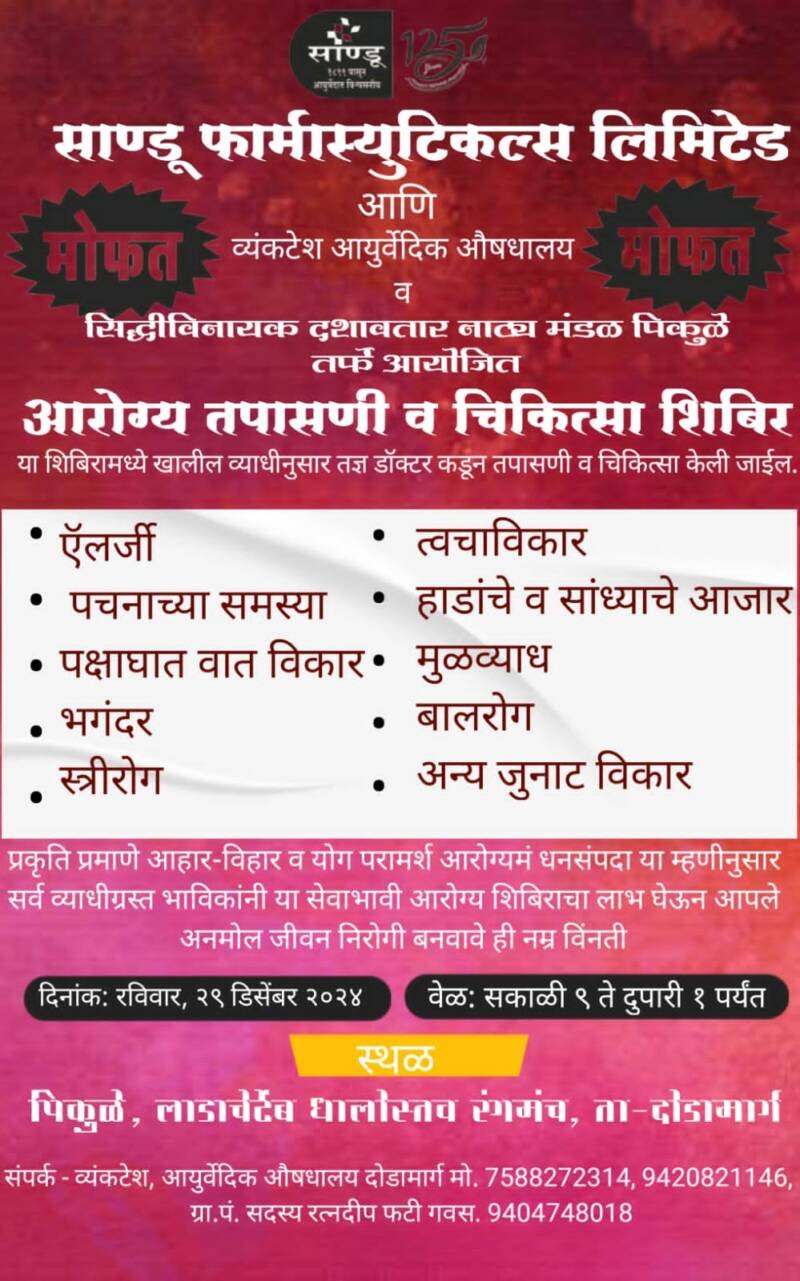 ЁЯО┤рджреЛрдбрд╛рдорд╛рд░реНрдЧ, рджрд┐-реирео :- рд╕рд╛рдгреНрдбреВ рдлрд╛рд░реНрдорд╛рд╕реНрдпреВрдЯреАрдХрд▓реНрд╕ рд▓рд┐рдорд┐рдЯреЗрдб рдЖрдгрд┐ рд╡реНрдпрдВрдХрдЯреЗрд╢ рдЖрдпреБрд░реНрд╡реЗрджрд┐рдХ рдФрд╖рдзрд╛рд▓рдп рд╡ рд╕рд┐рджреНрдзрд┐рд╡рд┐рдирд╛рдпрдХ рджрд╢рд╛рд╡рддрд╛рд░ рдирд╛рдЯреНрдп рдордВрдбрд│ рдкрд┐рдХреБрд│реЗ рддрд░реНрдлреЗ рдЖрд░реЛрдЧреНрдп рддрдкрд╛рд╕рдгреА рд╡ рдЪрд┐рдХрд┐рддреНрд╕рд╛ рд╢рд┐рдмрд┐рд░ рд░рд╡рд┐рд╡рд╛рд░ рджрд┐. реиреп рдбрд┐рд╕реЗрдВрдмрд░ рд░реЛрдЬреА рд╕рдХрд╛рд│реА реп рддреЗ рез рд╡рд╛рдЬреЗрдкрд░реНрдпрдВрдд рдЖрдпреЛрдЬрд┐рдд рдХрд░рдгреНрдпрд╛рдд рдЖрд▓реЗ рдЖрд╣реЗ. рд╣реЗ рд╢рд┐рдмрд┐рд░ рдкрд┐рдХреБрд│реЗ рд▓рд╛рдбрд╛рдЪреЗрдЯреЗрдВрдм рдзрд╛рд▓реЛрддреНрд╕рд╡ рд░рдВрдЧрдордВрдЪ рдпреЗрдереЗ рдпрд╛ рд╣реЛрдгрд╛рд░ рдЖрд╣реЗ.