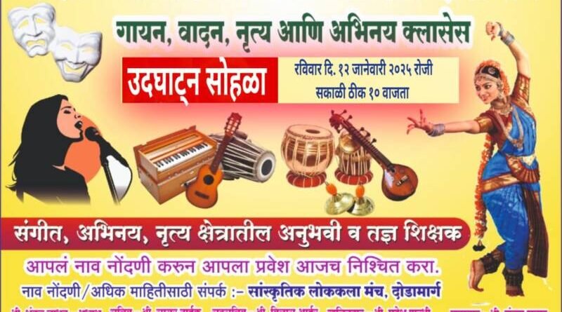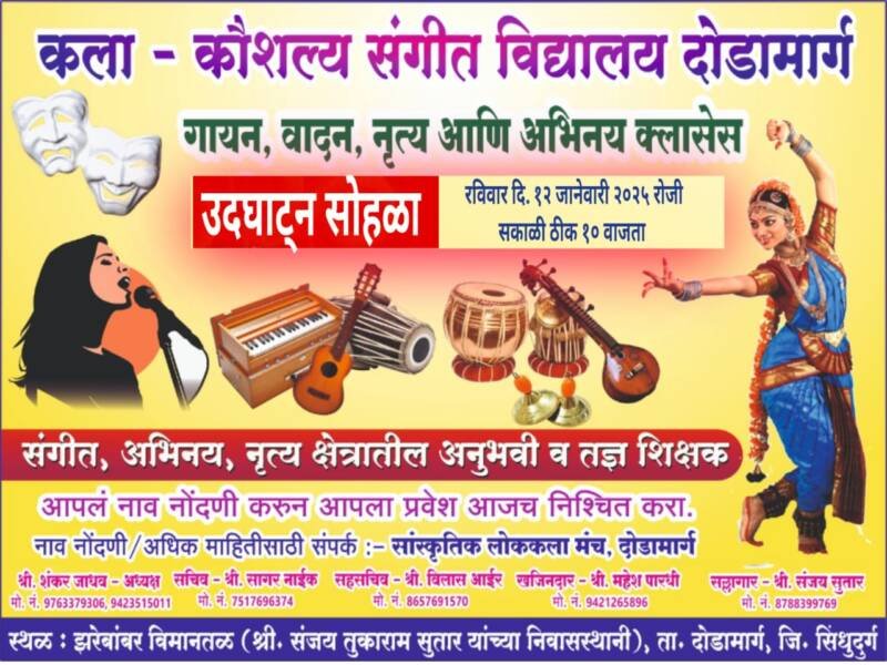 ЁЯЫС рдХрд▓рд╛ – рдХреМрд╢рд▓реНрдп рд╕рдВрдЧреАрдд рд╡рд┐рджреНрдпрд╛рд▓рдп рджреЛрдбрд╛рдорд╛рд░реНрдЧ рдпрд╛ рд╕рдВрдЧреАрдд рд╡рд┐рджреНрдпрд╛рд▓рдпрд╛рдЪрд╛ рдЙрджрдШрд╛рдЯреНрди рд╕реЛрд╣рд│рд╛ рд░рд╡рд┐рд╡рд╛рд░ рджрд┐. резреи рдЬрд╛рдиреЗрд╡рд╛рд░реА реирежреирел рд░реЛрдЬреА