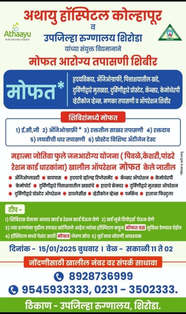 *🎴वेंगुर्ले, दि- ०४:-* शिरोडा (ता. वेंगुर्ले) येथील उपजिल्हा रुग्णालयात ,अथायु हॉस्पिटल कोल्हापूर व उपजिल्हा रुग्णालय शिरोडा यांच्या संयुक्त विद्यमाने मोफत आरोग्य तपासणी शिबिर बुधवार दिनांक १५ जानेवारी २०२५ रोजी सकाळी ११ ते दुपारी २:०० वा. या वेळेत आयोजित केले आहे.या शिबिरामध्ये १)ईसीजी, २)अँजिओग्राफी,३) रक्तातील साखर तपासणी४) रक्तदाब ५)लघवीची धार तपासणी,६) प्रोस्टेट विशिष्ट अँटीजेन टेस्ट या मोफत सुविधा केल्या जाणार आहे .