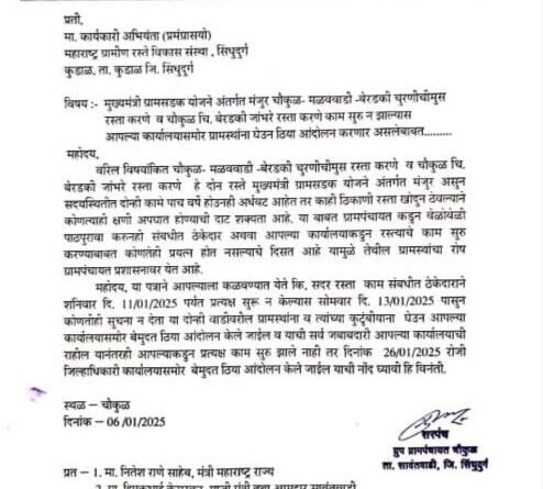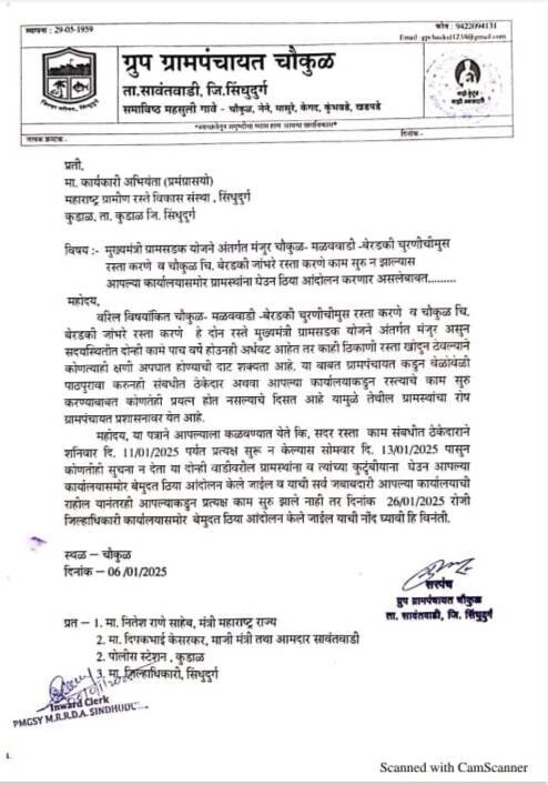 *🎴सावंतवाडी, दि- ०७:-*मुख्यमंत्री ग्रामसडक योजने अंतर्गत मंजुर चौकुळ- मळववाडी-बेरडकी चुरणीचीमुस रस्ता व चौकुळ चि. बेरडकी जांभरे रस्ता करणे काम सुरु न झाल्यास कार्यकारी अभियंता कार्यालयासमोर ग्रामस्थांना घेउन ठिया आंदोलन करणार असल्याचे निवेदन चौकुळ ग्रामपंचायत तर्फे संबंधित विभागाला देण्यात आले.
