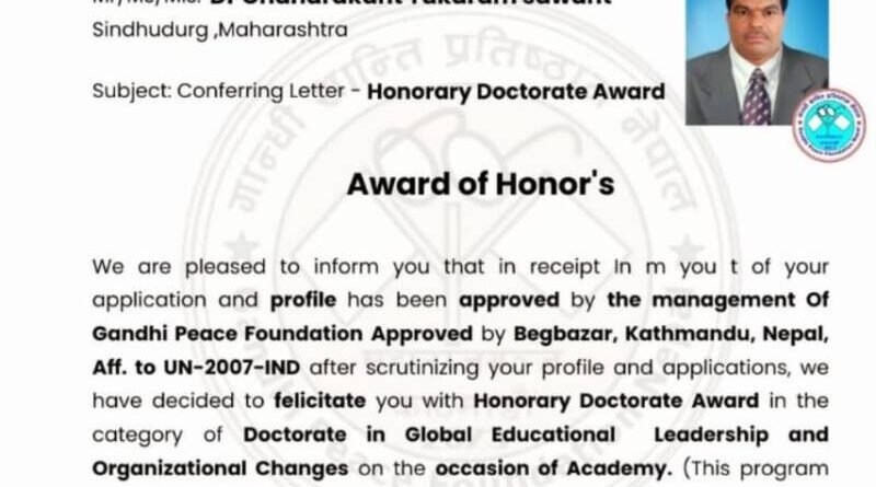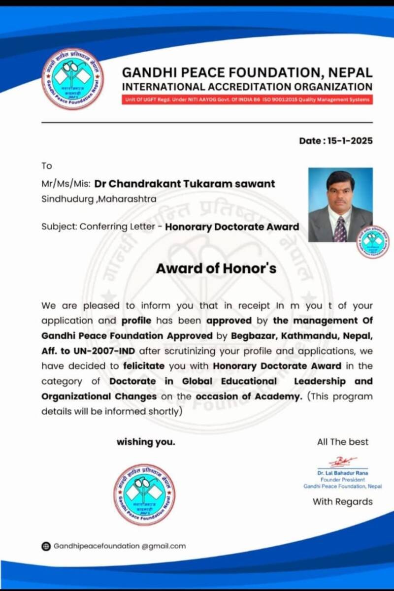 рд╕рд╛рдорд╛рдЬрд┐рдХ рдЖрдгрд┐ рд╢реИрдХреНрд╖рдгрд┐рдХ рдХреНрд╖реЗрддреНрд░рд╛рддреАрд▓ рдкреНрд░реЗрд░рдгрд╛рджрд╛рдпреА рдХрд╛рд░реНрдпрд╛рдЪреА рджрдЦрд▓ рдШреЗрдКрди рдХрд╛рд░реНрдпрд╛рдЪреЗ рдХреМрддреБрдХ рдореНрд╣рдгреВрди Gandhi Peace Foundation, Nepal рдХрдбреВрди Doctorate in Global Educational Leadership and Organizational Changes рдорд╛рдирдж рдбреЙрдХреНрдЯрд░реЗрдЯ рд╕рд╛рдареА Dr. Lal Bahadur Rana Founder President Gandhi Peace Foundation Nepal & Dr. Dipak Jadhav рдпрд╛рдВрдиреА рдирд┐рд╡рдб рдХрд░реВрди рдХрд╛рд░реНрдпрдХреНрд░рдорд╛рдд рдкреНрд░рджрд╛рди рдХрд░рдгреНрдпрд╛рдд рдпреЗрдгрд╛рд░ рдЖрд╣реЗ. рд╕рджрд░ рдирд╡рд╡реА рдбреЙрдХреНрдЯрд░реЗрдЯ рд╢реИрдХреНрд╖рдгрд┐рдХ рд╕рд╛рдорд╛рдЬрд┐рдХ рд╕рдорд╛рдЬ рдХрд╛рд░реНрдпрд╛рд╕рд╛рдареА рдкреНрд░рд╛рдкреНрдд рдЭрд╛рд▓реА рдЖрд╣реЗ.