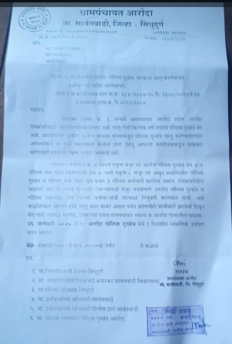 *ЁЯО┤рд╕рд╛рд╡рдВрддрд╡рд╛рдбреА, рджрд┐- резреп:-* рдЖрд░реЛрдВрджрд╛ рдЧреНрд░рд╛рдордкрдВрдЪрд╛рдпрдд рд╣рджреНрджреАрдд рдЕрд╕рдгрд╛рд░реЗ рдЖрд░реЛрдВрджрд╛ рдкрдВрдЪрдХреНрд░реЛрд╢реАрд╕рд╛рдареА рдЖрд░реЛрдВрджрд╛ рдкреЛрд▓реАрд╕ рджреБрд░рдХреНрд╖реЗрддреНрд░ рдЖрд╣реЗ рдкрд░рдВрддреБ рдЧреЗрд▓реА рдХрд┐рддреНрдпреЗрдХ рд╡рд░реНрд╖ рд╕рджрд░рдЪреЗ рдкреЛрд▓реАрд╕ рджреБрд░рдХреНрд╖реЗрддреНрд░ рдмрдВрдж рдЕрд╕реВрди,рдпрд╛рдмрд╛рдмрдд рдЧреНрд░рд╛рдордкрдВрдЪрд╛рдпрдд рдЖрд░реЛрдВрджрд╛ рд╡ рдЗрддрд░ рдЧреНрд░рд╛рдорд╕реНрде рдпрд╛рдВрдЪреНрдпрд╛рдХрдбреВрди рдкреЛрд▓реАрд╕ рджреБрд░реБрдХреНрд╖реЗрддреНрд░ рдЪрд╛рд▓реВ рдХрд░рдгреНрдпрд╛рд╕рдВрджрд░реНрднрд╛рдд рд╕рдВрдмрдВрдзрд┐рдд рдХрд╛рд░реНрдпрд╛рд▓рдпрд╛рд╢реА рдкрддреНрд░рд╡реНрдпрд╡рд╣рд╛рд░ рдХреЗрд▓реЗрд▓рд╛ рд╣реЛрддрд╛. рдкрд░рдВрддреБ рдпрд╛ рдХрд╛рд░реНрдпрд╛рд▓рдпрд╛рдХрдбреВрди рдпрд╛рдмрд╛рдмрдд рдХреЛрдгрддреНрдпрд╛рд╣реА рдкреНрд░рдХрд╛рд░рдЪреА рджрдЦрд▓ рдШреЗрдгреНрдпрд╛рдд рдЖрд▓реЗрд▓реА рдирд╛рд╣реА.