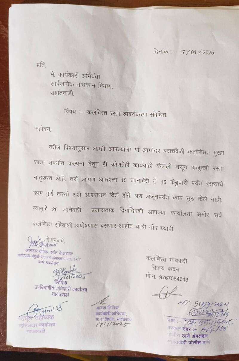 ЁЯО┤рд╕рд╛рд╡рдВрддрд╡рд╛рдбреА, рджрд┐-реиреи:- рдХрд▓рдВрдмрд┐рд╕реНрдд рдореБрдЦреНрдп рд░рд╕реНрддрд╛ рдЦрдбреАрдХрд░рдг рдХрд░реВрди рдмрд░реЗрдЪ рджрд┐рд╡рд╕ рдЭрд╛рд▓реЗ рдорд╛рддреНрд░ рддреНрдпрд╛рд╡рд░ рдЕрджреНрдпрд╛рдк рдкрд░реНрдпрдВрдд рдбрд╛рдВрдмрд░реАрдХрд░рдг рдХрд░рдгреНрдпрд╛рдд рдЖрд▓реЗрд▓реЗ рдирд╛рд╣реА.рдЕрдиреЗрдХ рд╡реЗрд│рд╛ рдпрд╛рд╡рд┐рд╖рдпреА рдЖрд╡рд╛рдЬ рдЙрдард╡реВрди рджреЗрдЦреАрд▓ рдЕрдЬреВрдирд╣реА рд╣рд╛ рд░рд╕реНрддрд╛ рдирд╛рджреБрд░реБрд╕реНрдд рдЖрд╣реЗ.рд╣рд╛ рд░рд╕реНрддрд╛ рд╡реНрд╣рд╛рд╡рд╛ рдпрд╛рд╕рд╛рдареА рдЕрдиреЗрдХ рд╡реЗрд│рд╛ рдкрд╛рдардкреБрд░рд╛рд╡рд╛ рдХрд░рдгреНрдпрд╛рдд рдЖрд▓реЗрд▓рд╛ рд╣реЛрддрд╛. рдорд╛рддреНрд░ рд╕рд╛рд░реНрд╡рдЬрдирд┐рдХ рдмрд╛рдВрдзрдХрд╛рдо рд╡рд┐рднрд╛рдЧ рдпрд╛рдХрдбреЗ рдЬрд╛рдгреАрд╡рдкреВрд░реНрд╡рдХ рджреБрд░реНрд▓рдХреНрд╖ рдХрд░рдд рдЖрд╣реЗ,рддрд╕реЗрдЪ рдпрд╛ рдкреВрд░реНрд╡реА резрел рдЬрд╛рдирд╛рд╡реЗрд░реА рддреЗ резрел рдлреЗрдмреНрд░реБрд╡рд╛рд░реА рдкрд░реНрдпрдВрдд рд░рд╕реНрддреНрдпрд╛рдЪреЗ рдХрд╛рдо рдкреБрд░реНрдг рдХрд░рддреЛ рдЕрд╕реЗ рдЖрд╢реНрд╡рд╛рд╕рди рдмрд╛рдВрдзрдХрд╛рдо рд╡рд┐рднрд╛рдЧрд╛рдиреЗ рджрд┐рд▓реЗ рд╣реЛрддреЗ. рдкрдг рдЕрдЬреВрдирдкрд░реНрдпрдВрдд рдХрд╛рдо рд╕реБрд░реБ рдХреЗрд▓реЗ рдирд╛рд╣реА. рддреНрдпрд╛рдореБрд│реЗ реирем рдЬрд╛рдиреЗрд╡рд╛рд░реА рдкреНрд░рдЬрд╛рд╕рддреНрддрд╛рдХ рджрд┐рдирд╛рджрд┐рд╡рд╢реА рд╕рд╛рд░реНрд╡рдЬрдирд┐рдХ рдмрд╛рдВрдзрдХрд╛рдо рд╡рд┐рднрд╛рдЧ рд╕рд╛рд╡рдВрддрд╡рд╛рдбреА рдХрд╛рд░реНрдпрд╛рд▓рдпрд╛ рд╕рдореЛрд░ рд╕рд░реНрд╡ рдХрд▓рдВрдмрд┐рд╕реНрдд рд░рд╣рд┐рд╡рд╛рд╢реА рдЙрдкреЛрд╖рдгрд╛рд╕ рдмрд╕рдгрд╛рд░ рдЖрд╣реЛрдд рдЕрд╕реЗ рдкрддреНрд░ рдХрд▓рдВрдмрд┐рд╕реНрдд рдЧреНрд░рд╛рдорд╕реНрде рд╡рд┐рдЬрдп рдХрджрдо рдпрд╛рдВрдиреА рдмрд╛рдВрдзрдХрд╛рдо рд╡рд┐рднрд╛рдЧрд╛рд▓рд╛ рджрд┐рд▓реЗ рдЖрд╣реЗ.