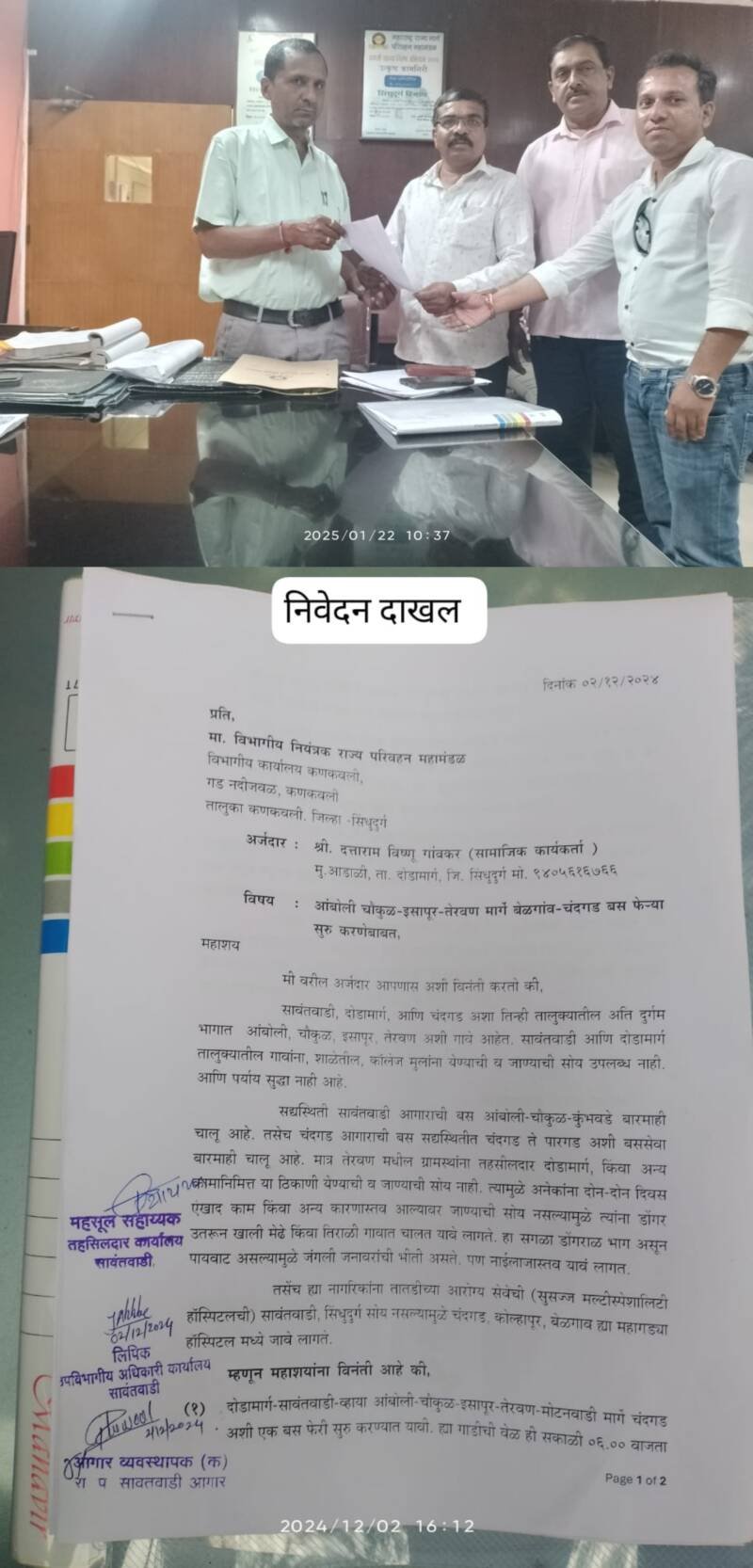 рддреЗрд░рд╡рдг рд╣реЗ рдЧрд╛рд╡ рджреЛрдбрд╛рдорд╛рд░реНрдЧ рддрд╛рд▓реБрдХреНрдпрд╛рдд рдпреЗрдд рдЕрд╕реВрди рдпрд╛ рдЧрд╛рд╡рд╛рдЪреНрдпрд╛ рджреЛрдиреНрд╣реА рдмрд╛рдЬреВрд▓рд╛ рдХреЛрд▓реНрд╣рд╛рдкреВрд░ рдЬрд┐рд▓реНрд╣реНрдпрд╛рдЪреА рд╣рджреНрдж рд▓рд╛рдЧрдд рдЕрд╕реВрди рдХреЛрд▓реНрд╣рд╛рдкреВрд░ рдЬрд┐рд▓реНрд╣реНрдпрд╛рддреАрд▓ рдЧрд╛рд╡реЗ рдЖрд╣реЗрдд. рдпрд╛ рдЧрд╛рд╡рд╛рддреАрд▓ рд▓реЛрдХрд╛рдВрдирд╛ рдЧреНрд░рд╛рдордкрдВрдЪрд╛рдпрдд рдХрд╛рд░реНрдпрд╛рд▓рдп рдЧрд╛рдардгреНрдпрд╛рд╕рд╛рдареА рдЖрда рдХрд┐рд▓реЛрдореАрдЯрд░ рдкрд╛рдпрдкреАрдЯ рдХрд░рдгреНрдпрд╛рд╢рд┐рд╡рд╛рдп рдкрд░реНрдпрд╛рдп рдирд╛рд╣реА. рдпрд╛ рдард┐рдХрд╛рдгреА рд░рд╕реНрддреНрдпрд╛рдЪреЗ рдорд╛рддреАрдХрд╛рдо рдЭрд╛рд▓реЗ рдЕрд╕реВрди рддреНрдпрд╛рдирдВрддрд░ рдХреЛрдгрддреАрд╣реА рд░рд╕реНрддреНрдпрд╛рдЪреА рджреБрд░реБрд╕реНрддреА рдирд╕рд▓реНрдпрд╛рдореБрд│реЗ рд╣рд╛ рд░рд╕реНрддрд╛ рдкреНрд░рд╡рд╛рд╕рд╛рд╕рд╛рдареА рдЕрддреНрдпрдВрдд рдзреЛрдХрд╛рджрд╛рдпрдХ рдмрдирд▓рд╛ рдЖрд╣реЗ. рд╕рдзреНрдпрд╛ рд╣реЗ рдЧрд╛рд╡ рддреЗрд░рд╡рдг, рдИрд╕рд╛рдкреБрд░ ,рдЪреМрдХреБрд│ ,рдЖрдВрдмреЛрд▓реА рдорд╛рд░реНрдЧреЗ рд╕рд╛рд╡рдВрддрд╡рд╛рдбреА рддрд╛рд▓реБрдХреНрдпрд╛рд▓рд╛ рдЬреЛрдбрд▓реЗ рдЧреЗрд▓реЗрд▓реЗ рдЖрд╣реЗ рдорд╛рддреНрд░ рдпрд╛ рдорд╛рд░реНрдЧрд╛рд╡рд░реВрди рд╕рд┐рдВрдзреБрджреБрд░реНрдЧрд╛рдд рдкреНрд░рд╡рд╛рд╕ рдХрд░рдгреНрдпрд╛рд╕рд╛рдареА рдХреЛрдгрддреАрд╣реА рдПрд╕рдЯреА рдмрд╕ рд╕реЗрд╡рд╛ рдЙрдкрд▓рдмреНрдз рдирд╕рд▓реНрдпрд╛рдиреЗ рдирд╛рдЧрд░рд┐рдХрд╛рдВрдирд╛ 25 рдХрд┐рд▓реЛрдореАрдЯрд░ рдкрд░реНрдпрдВрдд рдЦрд╛рдЬрдЧреА рд╡рд╛рд╣рдирд╛рдиреЗ рдкреНрд░рд╡рд╛рд╕ рдХрд░реВрди рдЖрдВрдмреЛрд▓реА рдкрд░реНрдпрдВрдд рдпрд╛рд╡реЗ рд▓рд╛рдЧрддреЗ рд╡ рддреНрдпрд╛рдирдВрддрд░ рд╕рд╛рд╡рдВрддрд╡рд╛рдбреА рдХрд┐рдВрд╡рд╛ рдЬрд┐рд▓реНрд╣рд╛ рдореБрдЦреНрдпрд╛рд▓рдп рдард┐рдХрд╛рдгреА рдкреНрд░рд╢рд╛рд╕рдХреАрдп рдХрд╛рдорд╛рд╕рд╛рдареА рдЬрд╛рд╡реЗ рд▓рд╛рдЧрддреЗ. рддрд░ рджреЛрдбрд╛рдорд╛рд░реНрдЧ рддрд╣рд╕реАрд▓рджрд╛рд░ рдХрд╛рд░реНрдпрд╛рд▓рдп рдЧрд╛рдардгреНрдпрд╛рд╕рд╛рдареА рдЖрда рдХрд┐рд▓реЛрдореАрдЯрд░рдЪреА рдкрд╛рдпрдкреАрдЯ рдХрд░реВрди рдореЗрдвреЗ рдЧрд╛рд╡рд╛рддреВрди рдирдВрддрд░ рджреЛрдбрд╛рдорд╛рд░реНрдЧ рдкрд░реНрдпрдВрдд рдкреНрд░рд╡рд╛рд╕ рдХрд░рд╛рд╡рд╛ рд▓рд╛рдЧрддреЛ рдпрд╛ рднрд╛рдЧрд╛рддреАрд▓ рдирд╛рдЧрд░рд┐рдХрд╛рдВрдиреА рд╡рд╛рд░рдВрд╡рд╛рд░ рдПрд╕рдЯреА рдкреНрд░рд╢рд╛рд╕рдирд╛рдХрдбреЗ рд╡ рд▓реЛрдХрдкреНрд░рддрд┐рдирд┐рдзреАрдВрдХрдбреЗ рджреЛрдбрд╛рдорд╛рд░реНрдЧ- рд╕рд╛рд╡рдВрддрд╡рд╛рдбреА -рдЖрдВрдмреЛрд▓реА -рдЪреМрдХреБрд│- рдЗрд╕рд╛рдкреВрд░- рддреЗрд░рд╡рдг рдорд╛рд░реНрдЧреЗ рдмреЗрд│рдЧрд╛рд╡ рдХрд┐рдВрд╡рд╛ рдЪрдВрджрдЧрдб рдЕрд╢реА рдмрд╕ рд╕реЗрд╡рд╛ рд╕реБрд░реВ рдХрд░рдгреНрдпрд╛рд╕рд╛рдареА рдирд┐рд╡реЗрджрдиреЗ рд╕рд╛рджрд░ рдХреЗрд▓реА рдорд╛рддреНрд░ рдЕрдзрд┐рдХрд╛рд░реА рд╡ рд▓реЛрдХрдкреНрд░рддрд┐рдирд┐рдзреАрдВрдиреА рдХрд╛рдЧрджреА рдШреЛрдбреЗ рдирд╛рдЪрд╡рдд рдпрд╛ рдирд┐рд╡реЗрджрдирд╛рдВрдирд╛ р