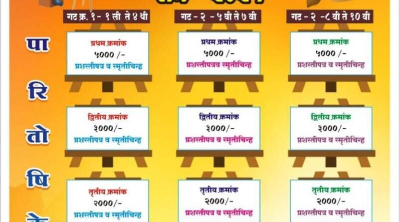 рд╣реА рд╕реНрдкрд░реНрдзрд╛ рддреАрди рдЧрдЯрд╛рдордзреНрдпреЗ рд╣реЛрдгрд╛рд░ рдЕрд╕реВрди ,рдЧрдЯ рдХреНрд░рдорд╛рдВрдХ рез) рдкрд╣рд┐рд▓реЗ рддреЗ рдЪреМрдереА рдпрд╛рд╕рд╛рдареА рдкреНрд░рдердо рдХреНрд░рдорд╛рдВрдХ релрежрежреж/- рдкреНрд░рд╢рд╕реНрддреАрдкрддреНрд░ рд╡ рд╕реНрдореГрддреАрдЪрд┐рдиреНрд╣, рджреНрд╡рд┐рддреАрдп рдХреНрд░рдорд╛рдВрдХ рейрежрежреж/- рдкреНрд░рд╢рд╕реНрддреАрдкрддреНрд░ рд╡ рд╕реНрдореГрддреАрдЪрд┐рдиреНрд╣, рддреГрддреАрдп рдХреНрд░рдорд╛рдВрдХ рдкреНрд░рд╢рд╕реНрддреАрдкрддреНрд░ рд╡ рд╕реНрдореГрддреАрдЪрд┐рдиреНрд╣, рдЧрдЯ рдХреНрд░рдорд╛рдВрдХ реи) рдкрд╛рдЪрд╡реА рддреЗ рд╕рд╛рддрд╡реА рдкреНрд░рдердо рдХреНрд░рдорд╛рдВрдХ релрежрежреж/_ рдкреНрд░рд╢рд╕реНрддреАрдкрддреНрд░ рд╕реНрдореГрддреА рдЪрд┐рдиреНрд╣, рджреНрд╡рд┐рддреАрдп рдХреНрд░рдорд╛рдВрдХ рейрежрежреж/- рдкреНрд░рд╢рд╕реНрддреАрдкрддреНрд░ рд╡ рд╕реНрдореГрддреАрдЪрд┐рдиреНрд╣, рддреГрддреАрдп рдХреНрд░рдорд╛рдВрдХ реирежрежреж/- рдкреНрд░рд╢рд╕реНрддреАрдкрддреНрд░ рд╡ рд╕реНрдореГрддреАрдЪрд┐рдиреНрд╣,рдЧрдЯ рей) рдЖрдард╡реА рддреЗ рджрд╣рд╛рд╡реА, рдкреНрд░рдердо рдХреНрд░рдорд╛рдВрдХ релрежрежреж/- рдкреНрд░рд╢рд╕реНрддреАрдкрддреНрд░ рд╡ рд╕реНрдореГрддреАрдЪрд┐рдиреНрд╣ рджреНрд╡рд┐рддреАрдп рдХреНрд░рдорд╛рдВрдХ рейрежрежреж/- рдкреНрд░рд╢рд╕реНрддреАрдкрддреНрд░ рд╡ рд╕реНрдореГрддреАрдЪрд┐рдиреНрд╣ ,рддреГрддреАрдп рдХреНрд░рдорд╛рдВрдХ реирежрежреж/- рдкреНрд░рд╢рд╕реНрддреАрдкрддреНрд░ рд╡ рд╕реНрдореГрддреАрдЪрд┐рдиреНрд╣ рджреЗрдгреНрдпрд╛рдд рдпреЗрдгрд╛рд░ рдЖрд╣реЗ.