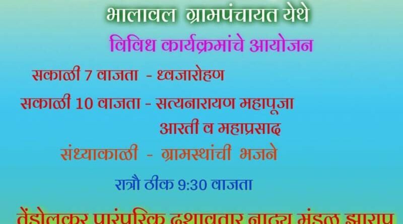рдпрдирд┐рдорд┐рддреНрдд рд╕рдХрд╛рд│реА рд╕рдХрд╛рд│реА рен рд╡рд╛рдЬрддрд╛ рдзреНрд╡рдЬрд╛рд░реЛрд╣рдг, рд╕рдХрд╛рд│реА резреж рд╡рд╛рдЬрддрд╛ рд╕рддреНрдпрдирд╛рд░рд╛рдпрдг рдорд╣рд╛рдкреВрдЬрд╛, рдЖрд░рддреА рддреАрд░реНрдердкреНрд░рд╕рд╛рдж рд╡ рдорд╣рд╛рдкреНрд░рд╕рд╛рдж, рд╕рд╛рдпрдВрдХрд╛- рдЧреНрд░рд╛рдорд╕реНрдерд╛рдВрдЪреА рднрдЬрдиреЗ, рд░рд╛рддреНрд░реА реп.рейреж рд╡рд╛рдЬрддрд╛ рдЭрд╛рд░рд╛рдк рдпреЗрдереАрд▓ рддреЗрдВрдбреЛрд▓рдХрд░ рдкрд╛рд░рдВрдкрд░рд┐рдХ рджрд╢рд╛рд╡рддрд╛рд░ рдирд╛рдЯреНрдп рдордВрдбрд│рд╛рдЪрд╛ ‘рджрдВрднрд╛рд╕реВрд░ рд╢рд┐рд╡рддреЗрдЬ рд╣рд░рдг’ рд╣рд╛ рдкреМрд░рд╛рдгрд┐рдХ рдирд╛рдЯреНрдпрдкреНрд░рдпреЛрдЧ рд╣реЛрдгрд╛рд░ рдЖрд╣реЗ. рдпрд╛ рд╕рд░реНрд╡ рдХрд╛рд░реНрдпрдХреНрд░рдорд╛рдВрдЪрд╛ рд▓рд╛рдн рдШреНрдпрд╛рд╡рд╛, рдЕрд╕реЗ рдЖрд╡рд╛рд╣рди рднрд╛рд▓рд╛рд╡рд▓ рдЧреНрд░рд╛рдордкрдВрдЪрд╛рдпрдд рд╡ рдЧрд╛рд╡рдХрд░реА рдпрд╛рдВрдЪреНрдпрд╛рд╡рддреАрдиреЗ рдХрд░рдгреНрдпрд╛рдд рдЖрд▓реЗ рдЖрд╣реЗ.