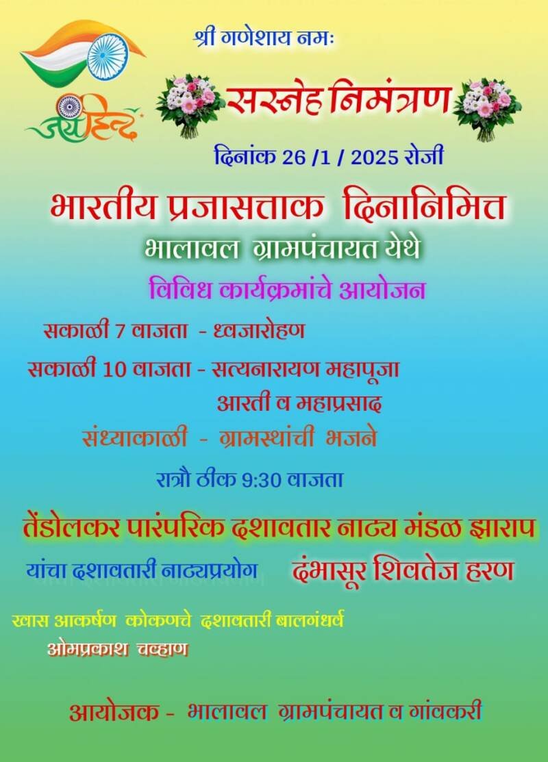 *ЁЯО┤рд╕рд╛рд╡рдВрддрд╡рд╛рдбреА, рджрд┐- реирем:-* рднрд╛рд░рддреАрдп рдкреНрд░рдЬрд╛рд╕рддреНрддрд╛рдХ рджрд┐рдирд╛рдирд┐рдорд┐рддреНрдд рднрд╛рд▓рд╛рд╡рд▓ рдЧреНрд░рд╛рдордкрдВрдЪрд╛рдпрдд рдпреЗрдереЗ рдЙрджреНрдпрд╛ реирем рдЬрд╛рдиреЗрд╡рд╛рд░реА рд░реЛрдЬреА рд╡рд┐рд╡рд┐рдз рдХрд╛рд░реНрдпрдХреНрд░рдорд╛рдВрдЪреЗ рдЖрдпреЛрдЬрди рдХрд░рдгреНрдпрд╛рдд рдЖрд▓реЗ рдЖрд╣реЗ.