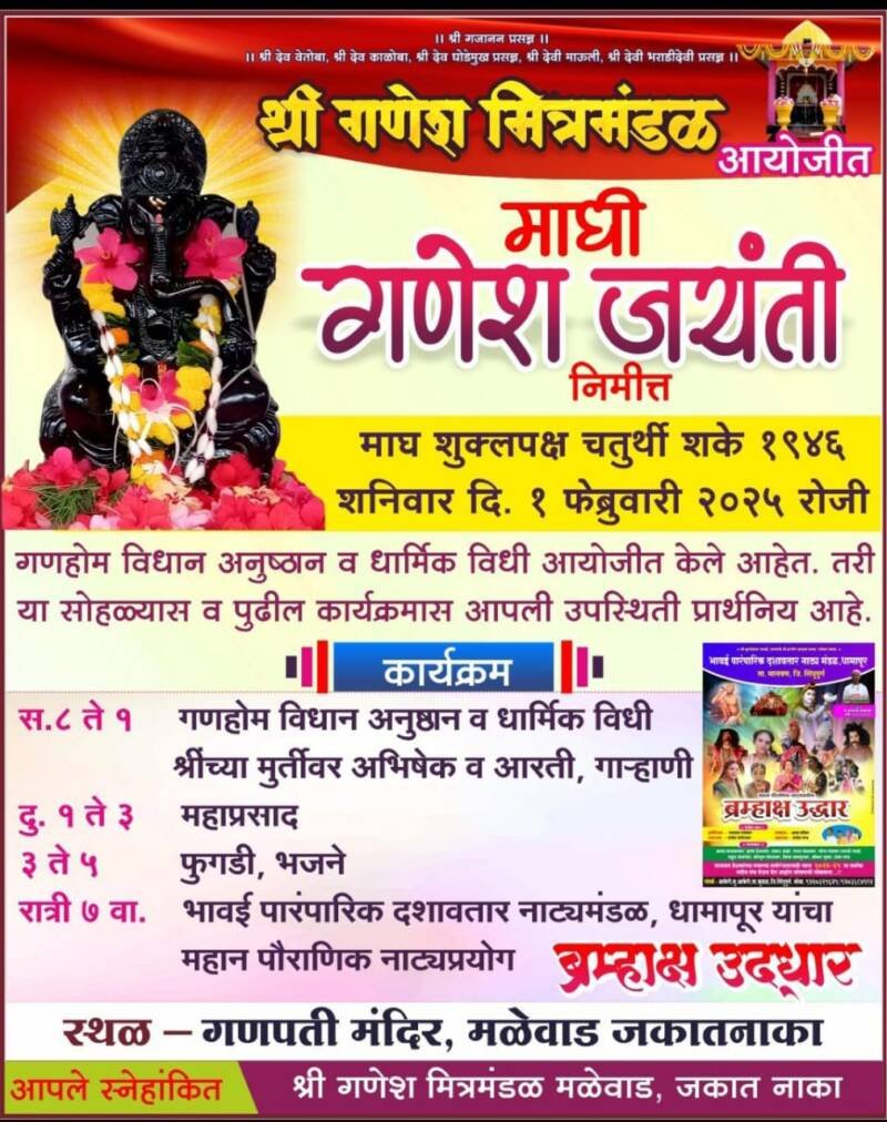 *ЁЯЫСрдорд│реЗрд╡рд╛рдб рдпреЗрдереЗ рез рдлреЗрдмреНрд░реБрд╡рд╛рд░реАрд▓рд╛ рдорд╛рдШреА рдЧрдгреЗрд╢ рдЬрдпрдВрддреА рдирд┐рдорд┐рддреНрдд рд╡рд┐рд╡рд┐рдз рдзрд╛рд░реНрдорд┐рдХ рдХрд╛рд░реНрдпрдХреНрд░рдо*