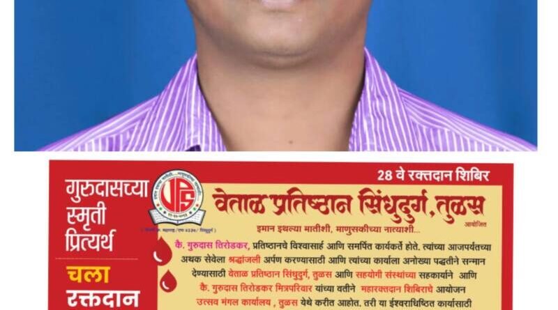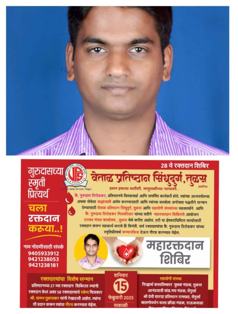 *ЁЯО┤рд╕рд╛рд╡рдВрддрд╡рд╛рдбреА, рджрд┐- режрей:-* рдЧреБрд░реБрджрд╛рд╕ рддрд┐рд░реЛрдбрдХрд░, рдкреНрд░рддрд┐рд╖реНрдард╛рдирдЪреЗ рд╡рд┐рд╢реНрд╡рд╛рд╕рд╛рд░реНрд╣ рдЖрдгрд┐ рд╕рдорд░реНрдкрд┐рдд рдХрд╛рд░реНрдпрдХрд░реНрддреЗ рд╣реЛрддреЗ. рддреНрдпрд╛рдВрдЪреНрдпрд╛ рдЖрдЬрдкрд░реНрдпрдВрддрдЪреНрдпрд╛ рдЕрдердХ рд╕реЗрд╡реЗрд▓рд╛ рд╢реНрд░рджреНрдзрд╛рдВрдЬрд▓реА рдЕрд░реНрдкрдг рдХрд░рдгреНрдпрд╛рд╕рд╛рдареА рдЖрдгрд┐ рддреНрдпрд╛рдВрдЪреНрдпрд╛ рдХрд╛рд░реНрдпрд╛рд▓рд╛ рдЕрдиреЛрдЦреНрдпрд╛ рдкрджреНрдзрддреАрдиреЗ рд╕рдиреНрдорд╛рди рджреЗрдгреНрдпрд╛рд╕рд╛рдареА рд╡реЗрддрд╛рд│ рдкреНрд░рддрд┐рд╖реНрдард╛рди рд╕рд┐рдВрдзреБрджреБрд░реНрдЧ рддреБрд│рд╕ рдЖрдгрд┐ рд╕рд╣рдпреЛрдЧреА рд╕рдВрд╕реНрдерд╛рдВрдЪреНрдпрд╛ рдЖрдгрд┐ рдХреИ.рдЧреБрд░реБрджрд╛рд╕ рддрд┐рд░реЛрдбрдХрд░ рдорд┐рддреНрд░рдкрд░рд┐рд╡рд╛рд░ рдпрд╛рдВрдЪреНрдпрд╛ рд╕рд╣рдХрд╛рд░реНрдпрд╛рдиреЗ рдорд╣рд╛рд░рдХреНрддрджрд╛рди рд╢рд┐рдмрд┐рд░рд╛рдЪреЗ рдЖрдпреЛрдЬрди *рд╢рдирд┐рд╡рд╛рд░ рджрд┐рдирд╛рдВрдХ резрел рдлреЗрдмреНрд░реБрд╡рд╛рд░реА реирежреирел рд░реЛрдЬреА рдЙрддреНрд╕рд╡ рдордВрдЧрд▓ рдХрд╛рд░реНрдпрд╛рд▓рдп рддреБрд│рд╕ рдпреЗрдереЗ рд╕рдХрд╛рд│реА реп.режреж рд╡рд╛.* рдЖрдпреЛрдЬрд┐рдд рдХреЗрд▓реЗрд▓реЗ рдЖрд╣реЗ.