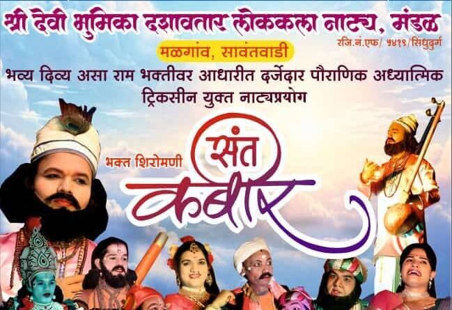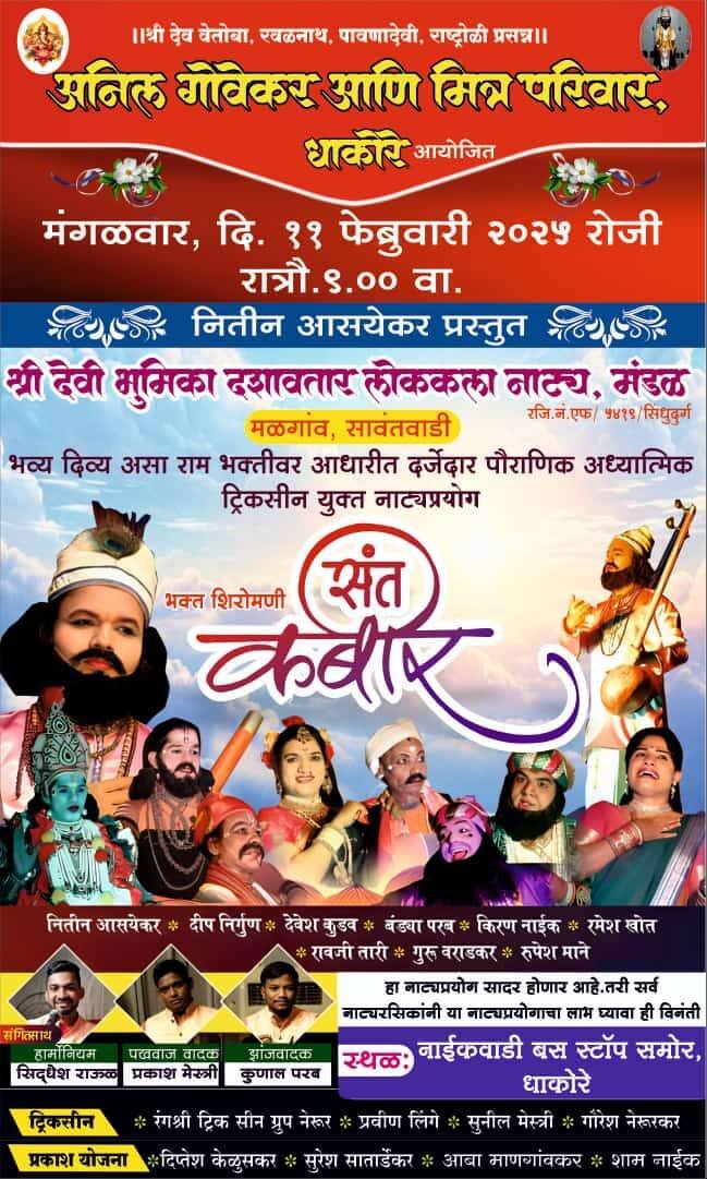 *ЁЯО┤рд╕рд╛рд╡рдВрддрд╡рд╛рдбреА, рджрд┐- режрек:-* рдзрд╛рдХреЛрд░реЗ рдпреЗрдереАрд▓ рдирд╛рдИрдХрд╡рд╛рдбреА рдмрд╕рд╕реНрдЯреЙрдк рдпреЗрдереЗ рдЕрдирд┐рд▓ рдЧреЛрд╡реЗрдХрд░ рдЖрдгрд┐ рдорд┐рддреНрд░рдордВрдбрд│рд╛рдЪреНрдпрд╛рд╡рддреАрдиреЗ рдордВрдЧрд│рд╡рд╛рд░ резрез рдлреЗрдмреНрд░реБрд╡рд╛рд░реА рд░реЛрдЬреА рд░рд╛рддреНрд░реА реп.режреж рд╡рд╛рдЬрддрд╛ рдирд┐рддреАрди рдЖрд╕рдпреЗрдХрд░ рдкреНрд░рд╕реНрддреБрдд рд╢реНрд░реА рджреЗрд╡реА рднреВрдорд┐рдХрд╛ рджрд╢рд╛рд╡рддрд╛рд░ рд▓реЛрдХрдХрд▓рд╛ рдирд╛рдЯреНрдп рдордВрдбрд│рд╛рдЪрд╛ рднрдХреНрдд рд╢рд┐рд░реЛрдордгреА ‘рд╕рдВрдд рдХрдмреАрд░’ рд╣рд╛ рд░рд╛рдо рднрдХреНрддреАрд╡рд░ рдЖрдзрд╛рд░рд┐рдд рдкреМрд░рд╛рдгрд┐рдХ рдЕрдзреНрдпрд╛рддреНрдорд┐рдХ рдЯреНрд░рд┐рдХрд╕реАрдирдпреБрдХреНрдд рдирд╛рдЯреНрдпрдкреНрд░рдпреЛрдЧ рд╣реЛрдгрд╛рд░ рдЖрд╣реЗ.