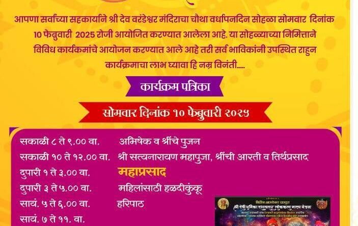рдпрдирд┐рдорд┐рддреНрдд резреж рдлреЗрдмреНрд░реБрд╡рд╛рд░реА рд░реЛрдЬреА рд╕рдХрд╛рд│реА рео рддреЗ реп.режреж рд╡рд╛рдЬрддрд╛ рдЕрднрд┐рд╖реЗрдХ рд╡ рд╢реНрд░реАрдВрдЪреЗ рдкреБрдЬрди, резреж рддреЗ резреи.режреж рд╡рд╛рдЬрддрд╛ рд╢реНрд░реА рд╕рддреНрдпрдирд╛рд░рд╛рдпрдг рдорд╣рд╛рдкреБрдЬрд╛, рд╢реНрд░реАрдВрдЪреА рдЖрд░рддреА рд╡ рддреАрд░реНрдердкреНрд░рд╕рд╛рдж, рджреБрдкрд╛рд░реА рез рддреЗ рей.режреж рд╡рд╛рдЬрддрд╛ рдорд╣рд╛рдкреНрд░рд╕рд╛рдж, рей рддреЗ рел.режреж рд╡рд╛рдЬрддрд╛ рдорд╣рд┐рд▓рд╛рдВрд╕рд╛рдареА рд╣рд│рджреАрдХреБрдВрдХреВ рд╕рд╛рдпрдВрдХрд╛рд│реА рел рддреЗ рем.режреж рд╡рд╛рдЬрддрд╛ рд╣рд░рд┐рдкрд╛рда рд╡ рд╕рд╛рдпрдВрдХрд╛рд│реА рен рд╡рд╛рдЬрддрд╛ рдирд┐рддреАрди рдЖрд╕рдпреЗрдХрд░ рдкреНрд░рд╕реНрддреБрдд рд╢реНрд░реА рджреЗрд╡реА рднреВрдорд┐рдХрд╛ рджрд╢рд╛рд╡рддрд╛рд░ рд▓реЛрдХрдХрд▓рд╛ рдирд╛рдЯреНрдпрдордВрдбрд│ рдпрд╛рдВрдЪрд╛ рд╢реНрд░реА рд╕рдВрдд рд╕рджреНрдЧреБрд░реБ рджреЗрд╡рд╛рд╡рддрд╛рд░реА рдмрд╛рд│реВрдорд╛рдорд╛ рдирд╛рдЯреНрдпрдкреНрд░рдпреЛрдЧ рд╣реЛрдгрд╛рд░ рдЖрд╣реЗ. рднрд╛рд╡рд┐рдХрд╛рдВрдиреА рдЙрдкрд╕реНрдерд┐рдд рд░рд╛рд╣реБрди рд╕рд░реНрд╡ рдХрд╛рд░реНрдпрдХреНрд░рдорд╛рдВрдЪрд╛ рд▓рд╛рдн рдШреНрдпрд╛рд╡рд╛, рдЕрд╕реЗ рдЖрд╡рд╛рд╣рди рджреЗрд╡ рд╡рд░рдВрдбреЗрд╢реНрд╡рд░ рдЙрддреНрд╕рд╡ рд╕рдорд┐рддреАрдЪреНрдпрд╛рд╡рддреАрдиреЗ рдХрд░рдгреНрдпрд╛рдд рдЖрд▓реЗ рдЖрд╣реЗ.