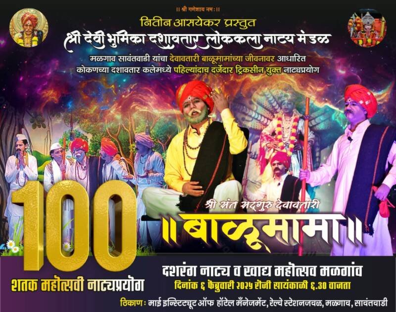 рд▓реЛрдХрдорд╛рдиреНрдп рдорд▓реНрдЯрд┐рдкрд░реНрдкрдЬрдЪреНрдпрд╛рд╡рддреАрдиреЗ рд╕рд╛рд╡рдВрддрд╡рд╛рдбреА рд░реЗрд▓реНрд╡реЗ рд╕реНрдерд╛рдирдХрд╛рд╡рд│реАрд▓ рдорд╛рдИ рдЗрдиреНрд╕реНрдЯрд┐рдЯрдпреВрдЯ рдСрдл рд╣реЙрдЯреЗрд▓ рдореЕрдиреЗрдЬрдореЗрдВрдЯ рдпреЗрдереЗ рдЖрдпреЛрдЬрд┐рдд рдХреЗрд▓реЗрд▓реНрдпрд╛ рджрд╢рд░рдВрдЧ рдирд╛рдЯреНрдп рд╡ рдЦрд╛рджреНрдп рдорд╣реЛрддреНрд╕рд╡рд╛рдд рд╣рд╛ рдирд╛рдЯреНрдпрдкреНрд░рдпреЛрдЧ рд╣реЛрдгрд╛рд░ рдЖрд╣реЗ. рдЖрддрд╛рдкрд░реНрдпрдВрдд рдпрд╛ рдирд╛рдЯреНрдпрдкреНрд░рдпреЛрдЧрд╛рдЪреЗ репреп рдкреНрд░рдпреЛрдЧ рдЭрд╛рд▓реЗ рдЖрд╣реЗрдд. рдЙрджреНрдпрд╛ резрежреж рд╡рд╛ рд╢рддрдХ рдорд╣реЛрддреНрд╕рд╡реА рдкреНрд░рдпреЛрдЧ рд╣реЛрдгрд╛рд░ рдЖрд╣реЗ. рдпрд╛ рдирд╛рдЯреНрдпрдкреНрд░рдпреЛрдЧрд╛рдд рдмрд╛рд│реВрдорд╛рдорд╛рдВрдЪреА рднреВрдорд┐рдХрд╛ рд╕рд╛рдХрд╛рд░реВрди рдмрд╛рд│реВрдорд╛рдорд╛рдВрдЪреНрдпрд╛ рдЪрд░рдгреА рд╕реЗрд╡рд╛ рдЕрд░реНрдкрдг рдХрд░рдд рдЖрд╣реЗрдд *рдЕрднрд┐рдирдп рдХреБрдорд╛рд░ рдирд┐рддреАрди рдЖрд╕рдпреЗрдХрд░.* рддрд░ рдЧрдгрдкрддреА-рд▓рдХреНрд╖реНрдореАрдХрд╛рдВрдд рдЧрд╛рд╡рдбреЗ, рд░рд┐рджреНрдзреА рд╕рд┐рджреНрдзреА-рд╢реНрд░реАрдзрд░ рд╕рд╛рд╡рдВрдд, рд╢рдВрдХрд░ рдЖрдгрд┐ рдорд╛рдВрддреНрд░рд┐рдХ-рдХрд┐рд░рдг рдирд╛рдИрдХ, рдмрд╛рд│рд╛рдкреНрдкрд╛ рдмрд╛рдЧрдбреЗ рдЖрдгрд┐ рдкрд╛рдЯреАрд▓-рд░рдореЗрд╢ рдЦреЛрдд, рдорд╛рдВрдЧ рджрд░реЛрдбреЗрдЦреЛрд░ рдЖрдгрд┐ рд╡рд╛рд░рдХрд░реА-рд░реБрдкреЗрд╢ рдорд╛рдиреЗ, рдирд╛рд░рдж рдЖрдгрд┐ рд╢рд┐рдВрдЧрд╛рдбреА-рджреЗрд╡реЗрд╢ рдХреБрдбрд╡, рд╕реБрд▓рднрд╛-рджреАрдк рдирд┐рд░реНрдЧреБрдг, рд╕рд╛рд╡рд┐рддреНрд░реА-рдмрдВрдбреНрдпрд╛ рдкрд░рдм, рднреИрд░реВ рдЖрдгрд┐ рд╡рд╛рд░рдХрд░реА-рдЧреБрд░реБ рд╡рд░рд╛рдбрдХрд░, рднрд╛рд▓рдЪрдВрджреНрд░ рдорд╣рд╛рд░рд╛рдЬ-рднрдЧрд╡рд╛рди рд╕рд╛рд╡рд│ рдЖрджреА рдХрд▓рд╛рдХрд╛рд░рд╣реА рднреВрдорд┐рдХрд╛ рд╕рд╛рдХрд╛рд░рдгрд╛рд░ рдЖрд╣реЗрдд. рдпрд╛ рд╕рд░реНрд╡ рдХрд▓рд╛рдХрд╛рд░рд╛рдВрдирд╛ рд╣рд╛рд░реНрдореЛрдирд┐рдпрдо-рд╕рд┐рджреНрдзреЗрд╢ рд░рд╛рдКрд│ рдкрдЦрд╡рд╛рдЬ-рдкреНрд░рдХрд╛рд╢ рдореЗрд╕реНрддреНрд░реА, рддрд╛рд▓рд░рдХреНрд╖рдХ-рдХреБрдгрд╛рд▓ рдкрд░рдм