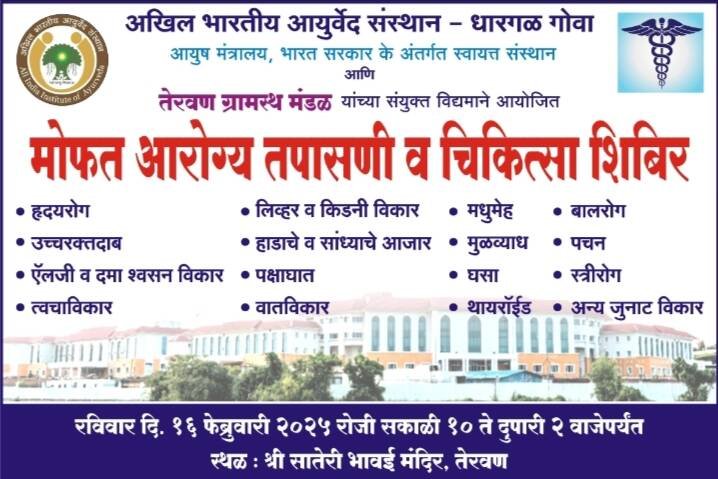 *ЁЯО┤рддреЗрд░рд╡рдг, рджрд┐- резрез:-* рдЕрдЦрд┐рд▓ рднрд╛рд░рддреАрдп рдЖрдпреБрд░реНрд╡реЗрдж рд╕рдВрд╕реНрдерд╛ рдзрд╛рд░рдЧрд│ (рдЧреЛрд╡рд╛) рдЖрдгрд┐ рддреЗрд░рд╡рдг рдЧреНрд░рд╛рдорд╕реНрде рдпрд╛рдВрдЪреНрдпрд╛ рд╕рдВрдпреБрдХреНрдд рд╡рд┐рджреНрдпрдорд╛рдиреЗ рд░рд╡рд┐рд╡рд╛рд░ рджрд┐рдирд╛рдВрдХ резрем рдлреЗрдмреНрд░реБрд╡рд╛рд░реА реирежреирел рд░реЛрдЬреА рд╢реНрд░реА рд╕рд╛рддреЗрд░реА рднрд╛рд╡рдИ рдордВрджреАрд░, рддреЗрд░рд╡рдг рдпреЗрдереЗ рдореЛрдлрдд рдЖрд░реЛрдЧреНрдп рддрдкрд╛рд╕рдгреА рд╡ рдЪрд┐рдХреАрддреНрд╕рд╛ рд╢рд┐рдмреАрд░ рдЖрдпреЛрдЬрди рдХрд░рдгреНрдпрд╛рдд рдЖрд▓реЗ рдЖрд╣реЗ.