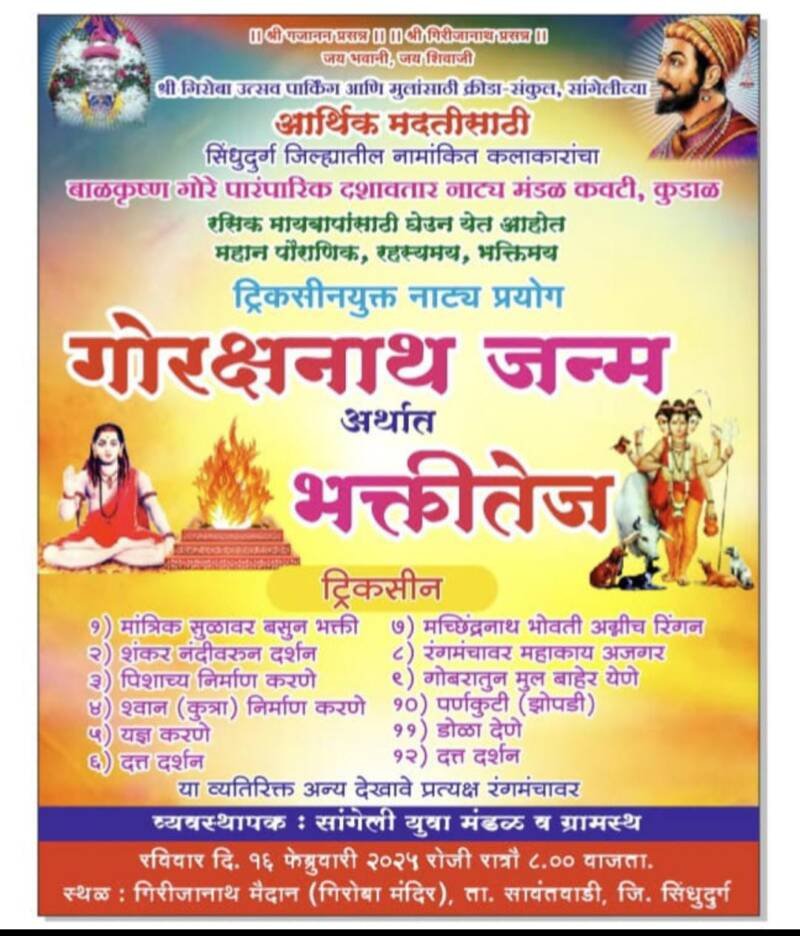 *ЁЯО┤рд╕рд╛рд╡рдВрддрд╡рд╛рдбреА, рджрд┐- резреи:-* рд╕рд╛рдВрдЧреЗрд▓реА рдпреЗрдереАрд▓ рд╢реНрд░реА рдЧрд┐рд░реАрдЬрд╛рдирд╛рде (рдЧрд┐рд░реЛрдмрд╛) рдордВрджрд┐рд░ рдпреЗрдереЗ рд░рд╡рд┐рд╡рд╛рд░ рджрд┐рдирд╛рдВрдХ резрем рдлреЗрдмреНрд░реБрд╡рд╛рд░реА реирежреирел рд░реЛрдЬреА рд╢реНрд░реА рдЧрд┐рд░реЛрдмрд╛ рдЙрддреНрд╕рд╡ рдкрд╛рд░реНрдХрд┐рдВрдЧ рд╡ рдореБрд▓рд╛рдВрд╕рд╛рдареА рдХреНрд░реАрдбрд╛ рд╕рдВрдХреБрд▓ рдЙрднрд╛рд░рдгреАрдЪреНрдпрд╛ рдЖрд░реНрдерд┐рдХ рдорджрддрдирд┐рдзреАрд╕рд╛рдареА рдЦрд╛рд╕ рдмрд╛рд│рдХреГрд╖реНрдг рдЧреЛрд░реЗ рдкрд╛рд░рдВрдкрд╛рд░рд┐рдХ рджрд╢рд╛рд╡рддрд╛рд░ рдирд╛рдЯреНрдп рдордВрдбрд│,рдХрд╡рдЯреА (рдХреБрдбрд╛рд│) рдпрд╛рдВрдЪрд╛ “рдЧреЛрд░рдХреНрд╖рдирд╛рде рдЬрдиреНрдо” рдЕрд░реНрдерд╛рдд “рднрдХреНрддреАрддреЗрдЬ рд╣рд╛ рдЯреНрд░рд┐рдХрд╕реАрдирдпреБрдХреНрдд рдирд╛рдЯреНрдп рдкреНрд░рдпреЛрдЧ рд░рд╛рддреНрд░реМ рео:режреж рд╡рд╛рдЬрддрд╛ рдЖрдпреЛрдЬрд┐рдд рдХреЗрд▓рд╛ рдЖрд╣реЗ.