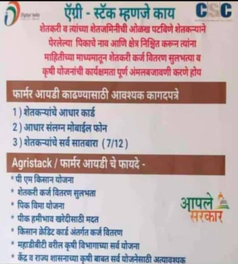 рдХреЗрдВрджреНрд░ рд╢рд╛рд╕рдирд╛рдЪреНрдпрд╛ agristack рдпрд╛ рдпреЛрдЬрдиреЗрддрдВрд░реНрдЧрдд рдлрд╛рд░реНрдорд░ рдЖрдпрдбреА рдХрд╛рдвреВрди рдШреЗрдгреЗ рд╕рд░реНрд╡ рд╢реЗрддрдХрд▒реНрдпрд╛рдВрд╕рд╛рдареА рдмрдВрдзрдирдХрд╛рд░рдХ рдЖрд╣реЗ рдЕрдиреНрдпрдерд╛ рдХреГрд╖рд┐рд╕рдВрдмрдВрдзреАрдд рд╕рд░реНрд╡ рдпреЛрдЬрдирд╛рдВрдЪреЗ рд▓рд╛рдн рддреНрдпрд╛рдВрдирд╛ рдорд┐рд│рдгрд╛рд░ рдирд╛рд╣реАрдд . рдлрд╛рд░реНрдорд░ рдЖрдпрдбреА рдХрд╛рдврдгреНрдпрд╛рд╕рд╛рдареА рдордВрдбрд│ рдЖрдЬрдЧрд╛рд╡ рдордзреАрд▓ рдЖрдЬрдЧрд╛рд╡,рднреЛрдорд╡рд╛рдбреА, рдорд│реЗ рд╡рд╛рдб,рдХреЛрдВрдбреБрд░реЗ,рддрд┐рд░реЛрдбрд╛,рдирд╛рдгреЛрд╕, рдзрд╛рдХреЛрд░реЗ,рдЖрд░реЛрдВрджрд╛,рддрд│рд╡рдгреЗ,рдХреАрдирд│реЗ, рдЧреВрд│рджреБрд╡реЗ рдпрд╛ рдЧрд╛рд╡рд╛рдд рд╕реАрдПрд╕рд╕реА рд╕реЗрдВрдЯрд░рдЪреНрдпрд╛ рдорд╛рд░реНрдлрдд рдиреЛрдВрджрдгреА рд╕реБрд░реВ рдЕрд╕реВрди рд╕рд░реНрд╡ рд╢реЗрддрдХрд░реА,рдЦрд╛рддреЗрджрд╛рд░ рдпрд╛рдВрдиреА рдЖрдЬ рд▓рд╡рдХрд░рд╛рдд рд▓рд╡рдХрд░ рдЖрдкрд▓реНрдпрд╛ рдЬрд╡рд│реАрд▓ рд╕реАрдПрд╕рд╕реА рд╕реЗрдВрдЯрд░рд╢реА рдЖрдкрд▓реНрдпрд╛ рдЬрдорд┐рдиреАрдЪрд╛ рдЖрда рдЕ, рд╕рд╛рддрдмрд╛рд░рд╛,рдЖрдзрд╛рд░рдХрд╛рд░реНрдб рд╡ рдЖрдзрд╛рд░рдХрд╛рд░реНрдбрд╢реА рд▓рд┐рдВрдХ рдЕрд╕рд▓реЗрд▓рд╛ рдореЛрдмрд╛рдЗрд▓ рдирдВрдмрд░ рдпрд╛рд╕рд╣ рд╕рдВрдкрд░реНрдХ рд╕рд╛рдзрд╛рд╡рд╛ рд╡ рдЖрдкрд▓реА рдиреЛрдВрджрдгреА рд╡реЗрд│реЗрдд рдкреВрд░реНрдг рдХрд░реВрди рдШреНрдпрд╛рд╡реА. рд╕рджрд░ рдиреЛрдВрджрдгреА рд╡реЗрд│реЗрдд рди рдХреЗрд▓реНрдпрд╛рд╕ рд╢рд╛рд╕рдХреАрдп рдпреЛрдЬрдирд╛рдВрдЪреЗ рд▓рд╛рдн рдорд┐рд│рдгрд╛рд░ рдирд╛рд╣реА рддреНрдпрд╛рдореБрд│реЗ рдЖрдкрд▓реЗ рдЗрддрд░ рд╕рд╣рд╣рд┐рд╕реНрд╕реЗрджрд╛рд░ рдмрд╛рд╣реЗрд░рдЧрд╛рд╡реА рдЕрд╕рддреАрд▓ рддрд░ рддреНрдпрд╛рдВрдирд╛ рджреЗрдЦреАрд▓ рдпрд╛рд╡рд┐рд╖рдпреА рдХрд▓реНрдкрдирд╛ рджреНрдпрд╛рд╡реА.рдЖрдЬрдкрд╛рд╕реВрди рджреЛрди рджрд┐рд╡рд╕рд╛рдд рд╕рд░реНрд╡рд╛рдВрдиреА рдЖрдкрд▓реА рдиреЛрдВрджрдгреА рдкреВрд░реНрдг рдХрд░реВрди рдШреНрдпрд╛рд╡реА рдЕрд╕реЗ рдЖрд╡рд╛рд╣рди рдЖрдЬрдЧрд╛рд╡ рдордВрдбрд│рд╛рддреАрд▓ рдордВрдбрд│ рдЕрдзрд┐рдХрд╛рд░реА рд╡ рдЧреНрд░рд╛рдо рдорд╣рд╕реВрд▓ рдЕрдзрд┐рдХрд╛рд░реА рдпрд╛рдВрдЪреНрдпрд╛ рд╡рддреАрдиреЗ рдХрд░рдгреНрдпрд╛рдд рдпреЗрдд рдЖрд╣реЗ.