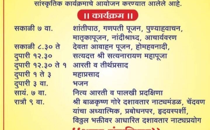 рд╕рдХрд╛рд│реА рео.рейреж рддреЗ рджреБрдкрд╛рд░реА резреи.рейреж тАУ рджреЗрд╡рддрд╛ рдЖрд╡рд╛рд╣рди рдкреВрдЬрди, рд╣реЛрдорд╣рд╡рдирд╛рджреА, рд╕рддреНрдпрджрддреНрдд рд╢реНрд░реА рд╕рддреНрдпрдирд╛рд░рд╛рдпрдг рдорд╣рд╛рдкреВрдЬрд╛