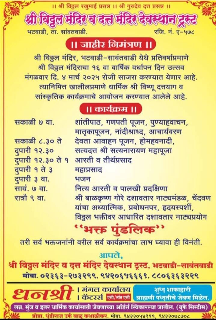*ЁЯО┤рд╕рд╛рд╡рдВрддрд╡рд╛рдбреА, рджрд┐- режрек:-* рд╢реНрд░реА рд╡рд┐рдареНрдард▓ рдордВрджрд┐рд░, рднрдЯрд╡рд╛рдбреА рдпреЗрдереЗ рдкреНрд░рддрд┐рд╡рд░реНрд╖рд╛рдкреНрд░рдорд╛рдгреЗ рд╢реНрд░реА рд╡рд┐рдареНрдард▓ рдордВрджрд┐рд░рд╛рдЪрд╛ резрем рд╡рд╛ рд╡рд╛рд░реНрд╖рд┐рдХ рд╡рд░реНрдзрд╛рдкрди рджрд┐рди рдЙрддреНрд╕рд╡ рдЖрдЬ рдордВрдЧрд│рд╡рд╛рд░ рджрд┐. рек рдорд╛рд░реНрдЪ реирежреирел рд░реЛрдЬреА рд╕рд╛рдЬрд░рд╛ рдХрд░рдгреНрдпрд╛рдд рдпреЗрдгрд╛рд░ рдЖрд╣реЗ. рддреНрдпрд╛рдирд┐рдорд┐рддреНрдд рдЦрд╛рд▓реАрд▓рдкреНрд░рдорд╛рдгреЗ рдзрд╛рд░реНрдорд┐рдХ рд╢реНрд░реА рд╡рд┐рд╖реНрдгреВ рджрддреНрддрдпрд╛рдЧ рд╡ рд╕рд╛рдВрд╕реНрдХреГрддрд┐рдХ рдХрд╛рд░реНрдпрдХреНрд░рдорд╛рдЪреЗ рдЖрдпреЛрдЬрди рдХрд░рдгреНрдпрд╛рдд рдЖрд▓реЗрд▓реЗ рдЖрд╣реЗ.