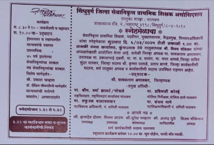 *ЁЯО┤рдорд╛рд▓рд╡рдг, рджрд┐- режрек:-* рд╕рд┐рдВрдзреБрджреБрд░реНрдЧ рдЬрд┐рд▓реНрд╣рд╛ рд╕реЗрд╡рд╛рдирд┐рд╡реГрддреНрдд рдкреНрд░рд╛рдердорд┐рдХ рд╢рд┐рдХреНрд╖рдХ рдЕрд╕реЛрд╢рд┐рдПрд╢рди рд╢рд╛рдЦрд╛ рдорд╛рд▓рд╡рдг рдордзреАрд▓ рдкреНрд░рд╛рдердорд┐рдХ рд╢рд┐рдХреНрд╖рдг рд╕реЗрд╡реЗрддреВрди рд╕реЗрд╡рд╛рдирд┐рд╡реГрддреНрдд рдЭрд╛рд▓реЗрд▓реЗ рдкреНрд░рд╛рдердорд┐рдХ рд╢рд┐рдХреНрд╖рдХ, рдкрджрд╡реАрдзрд░, рдореБрдЦреНрдпрд╛рдзреНрдпрд╛рдкрдХ рдЖрдгрд┐ рд╡рд┐рд╕реНрддрд╛рд░ рдЕрдзрд┐рдХрд╛рд░реА рдпрд╛рдВрдЪрд╛ рд╕реНрдиреЗрд╣рдореЗрд│рд╛рд╡рд╛ рд╡рд┐рдЬрдп рдЪреМрдХреЗрдХрд░ рддрд╛рд▓реБрдХрд╛рдзреНрдпрдХреНрд╖ рдпрд╛рдВрдЪреНрдпрд╛ рдЕрдзреНрдпрдХреНрд╖рддреЗрдЦрд╛рд▓реА рдЦрд╛рд▓реА рдЧреБрд░реБрд╡рд╛рд░ рджрд┐ . режрем / режрей / реирежреирел рд░реЛрдЬреА рд╕рдХрд╛рд│реА режрепрд╡рд╛ . рдЬрд╛рдирдХреА рдордВрдЧрд▓ рдХрд╛рд░реНрдпрд╛рд▓рдп рдХреБрдВрднрд╛рд░рдорд╛рда рдЬрд░реАрдорд░реА рдпреЗрдереЗ рдЖрдпреЛрдЬрд┐рдд рдХрд░рдгреНрдпрд╛рдд рдЖрд▓рд╛ рдЖрд╣реЗ .