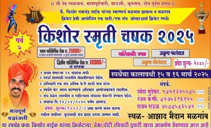 рдпрд╛ рд╕реНрдкрд░реНрдзрдд рдХреИ. рдХрд┐рд╢реЛрд░ рдирд╛рдИрдХ рдпрд╛рдВрдЪреНрдпрд╛ рдХреНрд░рд┐рдХреЗрдЯрдЪреНрдпрд╛ рдкреНрд░реЗрдорд╛рдкреЛрдЯреА рд░рд╡рд┐рд╡рд╛рд░реА резрем рдорд╛рд░реНрдЪ рд░реЛрдЬреА рджреБрдкрд╛рд░реА рдЦрд╛рд╕ рдЖрдХрд░реНрд╖рдг рдареЗрд╡рдгреНрдпрд╛рдд рдЖрд▓реЗ рдЖрд╣реЗ. рд╕реНрдкрд░реНрдзреЗрдд рдкреНрд░рдердо рдпреЗрдгрд╛рд▒реНрдпрд╛ резрем рд╕рдВрдШрд╛рдВрдирд╛ рд╕рдВрдзреА рджреЗрдгреНрдпрд╛рдд рдпреЗрдгрд╛рд░ рдЖрд╣реЗ. рд╕реНрдкрд░реНрдзрд╛ рд╕рд╛рдЦрд│реА рдкрдзреНрджрддреАрдиреЗ рдЦреЗрд│рд╡рд┐рдгреНрдпрд╛рдд рдпреЗрдИрд▓, рд╢рдирд┐рд╡рд╛рд░реА рдПрдХ рд╕рдВрдШ рдЕрдВрддреАрдо рдлреЗрд░реАрд╕рд╛рдареА рдкрд╛рддреНрд░ рдард░реЗрд▓, рд╕реНрдкрд░реНрдзреЗрдд рдлреЗрд░рдмрджрд▓ рдХрд░рдгреНрдпрд╛рдЪреЗ рдЕрдзрд┐рдХрд╛рд░ рдЖрдпреЛрдЬрдХрд╛рдВрдХрдбреЗ рд░рд╛рд╣рддреАрд▓, рд╕рдВрдШ рд╡реЗрд│реЗрдд рдЙрдкрд╕реНрдерд┐рдд рди рд░рд╛рд╣реАрд▓реНрдпрд╛рд╕ рд╕рдВрдШрд╛рд▓рд╛ рдкреЕрдирд▓реНрдЯреА рджреЗрдгреНрдпрд╛рдд рдпреЗрдИрд▓. рд╕реНрдкрд░реНрдзреЗрд╕рд╛рдареА рдкреНрд░рд╡реЗрд╢ рд╢реБрд▓реНрдХ рд░реБ. реирежрежреж/ рдЖрд╣реЗ, рдорд╛рддреНрд░ рднрд╛рдЧ рдШреЗрдгрд╛рд▒реНрдпрд╛ рд╕рдШрд╛рдВрдирд╛ резреи рдорд╛рд░реНрдЪрдкрд░реНрдпрдВрдд рдЖрдЧрд╛рдК рдкреНрд░рд╡реЗрд╢ рд╢реБрд▓реНрдХ рд░реБ. резрежрежреж рдЬрдорд╛ рдХрд░рдгреЗ рдмрдВрдзрдирдХрд╛рд░рдХ рд░рд╛рд╣реАрд▓ рдирд╛рд╣реАрддрд░ рдХреБрдард▓рд╛рд╣реА рд╕рдВрдз рдЧреНрд░рд╛рд╣реНрдп рдзрд░рд▓рд╛ рдЬрд╛рдгрд╛рд░ рдирд╛рд╣реА. рдпрд╛ рд╕реНрдкрд░реНрдзреЗрдд рднрд╛рдЧ рдШреЗрдгреНрдпрд╛рд╕рд╛рдареА рдЙрдореЗрд╢ рдЧреБрдбреЗрдХрд░-репрекреирезрейреирелрелреорел, рд░рдВрдЬрди рдХреЗрдгреА-реореиренрелрейрезремрезрелрел рд╡ рд░рд╛рдЬрди рд░рд╛рдКрд│- ренрелреореорелреорейрелрекреи рдпрд╛рдВрдЪреНрдпрд╛рд╢реА рд╕рдВрдкрд░реНрдХ рд╕рд╛рдзрд╛рд╡рд╛, рдЕрд╕реЗ рдЖрд╡рд╛рд╣рди рдорд│рдЧрд╛рд╡ рдЧреНрд░рд╛рдорд╕реНрде рд╡ рдорд│рдЧрд╛рд╡ рдХреНрд░рд┐рдХреЗрдЯ рдкреНрд░реЗрдореА рдпрд╛рдВрдЪреНрдпрд╛рд╡рддреАрдиреЗ рдХрд░рдгреНрдпрд╛рдд рдЖрд▓реЗ рдЖрд╣реЗ.