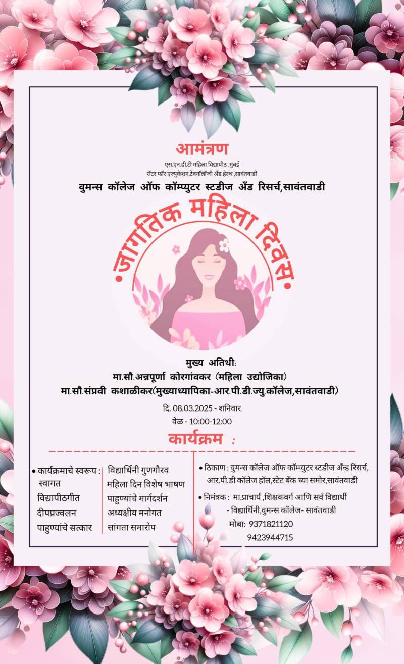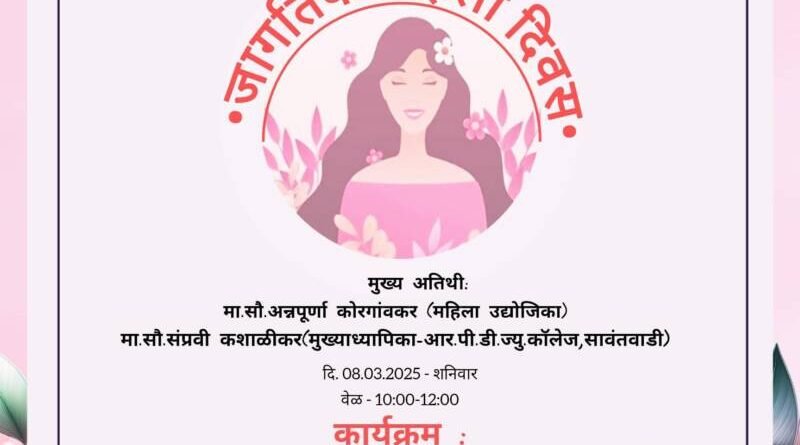 ЁЯЫС рд╕рд╛рд╡рдВрддрд╡рд╛рдбреА рдпреЗрдереАрд▓ рд╡реБрдордиреНрд╕ рдХреЙрд▓реЗрдЬ рдпреЗрдереЗ режрео рдорд╛рд░реНрдЪ рд░реЛрдЬреА рдЬрд╛рдЧрддрд┐рдХ рдорд╣рд┐рд▓рд╛ рджрд┐рдирд╛рдЪреЗ рдЖрдпреЛрдЬрди
