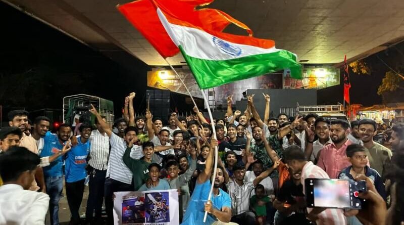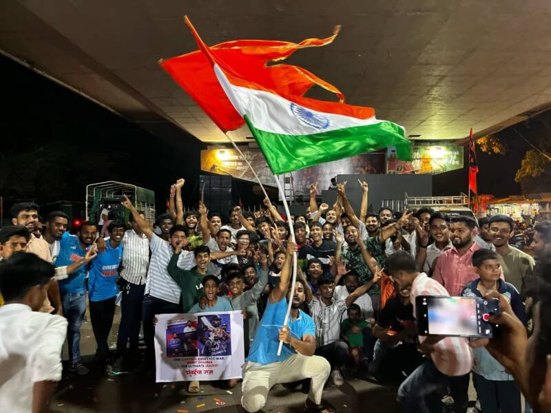 рд╣рд┐рдВрджреВ рд░рдХреНрд╖рдХ рд╕реЗрд╡рд╛ рд╡ рдЪрд┐рд░рддрд░реБрдг рдХрдгрдХрд╡рд▓реА рдпреБрд╡рд╛ рдордВрдЪ рдпрд╛рдВрдЪреНрдпрд╛рд╡рддреАрдиреЗ рднрд╛рд░рдд-рдиреНрдпреВрдЭреАрд▓рдВрдб рд▓рдврддреАрдЪрд╛ рд▓рд╛рдИрд╡реНрд╣ рд╕рд╛рдордирд╛ рдХрдгрдХрд╡рд▓реАрдХрд╛рд░рд╛рдВрдирд╛ рдкрд╛рд╣рддрд╛ рдпрд╛рд╡рд╛ рдпрд╛рд╕рд╛рдареА рдЫрддреНрд░рдкрддреА рд╢рд┐рд╡рд╛рдЬреА рдорд╣рд╛рд░рд╛рдЬ рдЪреМрдХ рдпреЗрдереЗ рдПрд▓рдИрдбреА рд╕реНрдХреНрд░реАрди рд▓рд╛рд╡рдгреНрдпрд╛рдд рдЖрд▓реА рд╣реЛрддреА. рд╣рд╛ рд╕рд╛рдордирд╛ рдкрд╛рд╣рдгреНрдпрд╛рд╕рд╛рдареА рдпрд╛ рдард┐рдХрд╛рдгреА рдХрд┐рдХреНрд░реЗрдЯрдкреНрд░реЗрдореАрдВрдЪреА рдореЛрдареА рдЧрд░реНрджреА рдЭрд╛рд▓реА рд╣реЛрддреА. рд▓рд╛рдИрд╡реНрд╣ рд╕рд╛рдордиреНрдпрд╛рдВрдЪрд╛ рдХрд┐рдХреНрд░реЗрдЯрдкреНрд░реЗрдореАрдВрдиреА рдЖрдирдВрдж рд▓реБрдЯрд▓рд╛. рд╡рд┐рдЬрдпрд╛рдирдВрддрд░ рдЪреМрдХрд╛рдд рдПрдХрдЪ рдЬрд▓реНрд▓реЛрд╖ рд╕рд╛рдЬрд░рд╛ рдХрд░рдд рдЯреАрдо рдЗрдВрдбрд┐рдпрд╛рдЪреНрдпрд╛ рд╡рд┐рдЬрдпрд╛рдЪреНрдпрд╛ рдХреНрд╖рдгрд╛рдЪреЗ рдХрдгрдХрд╡рд▓реАрдХрд░ рд╕рд╛рдХреНрд╖реАрджрд╛рд░рджреЗрдЦреАрд▓ рдЭрд╛рд▓реЗ. рднрд╛рд░рддрд╛рдЪрд╛ рддрд┐рд░рдВрдЧрд╛ рд╡ рднрдЧрд╡рд╛ рдЭреЗрдВрдбрд╛ рдлрдбрдХрд╡рдд рдореБрдВрдмрдИ рдЧреЛрд╡рд╛ рд╣рд╛рдпрд╡реЗ рд╡рд░реВрди рдмрд╛рдЬрд╛рд░рдкреЗрда – рдкрдЯрдХреА рджреЗрд╡реА рдордВрджрд┐рд░ рдорд╛рд░реНрдЧреЗ рд░реЗрд▓реНрд╡реЗ рд╕реНрдЯреЗрд╢рди рдирд░рдбрд╡реЗ рд░реЛрдб рддреЗ рдЫрддреНрд░рдкрддреА рд╢рд┐рд╡рд╛рдЬреА рдЪреМрдХрд╛рдд рдореЛрдЯрд░рд╕рд╛рдпрдХрд▓ рд░реЕрд▓реАрдиреЗ рдпрд╛рдЪреА рд╕рд╛рдВрдЧрддрд╛ рдЭрд╛рд▓реА.