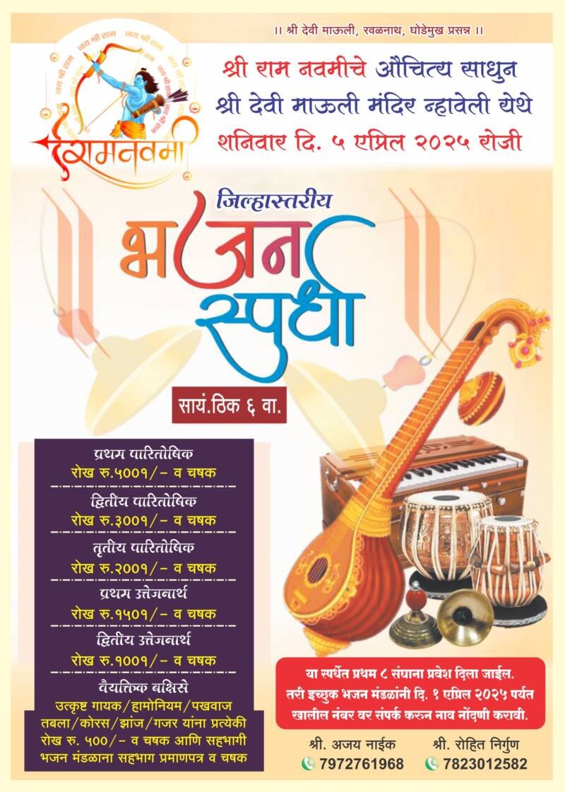 *ЁЯО┤рд╕рд╛рд╡рдВрддрд╡рд╛рдбреА, рджрд┐- реиреи:-* рд╢реНрд░реА рд░рд╛рдо рдирд╡рдореАрдЪреЗ рдФрдЪрд┐рддреНрдп рд╕рд╛рдзреБрди рд╢реНрд░реА рджреЗрд╡реА рдорд╛рдКрд▓реА рдордВрджрд┐рд░ рдиреНрд╣рд╛рд╡реЗрд▓реА рдпреЗрдереЗ рд╢рдирд┐рд╡рд╛рд░ рел рдПрдкреНрд░рд┐рд▓ рд░реЛрдЬреА рд╕рд╛рдпрдВрдХрд╛рд│реА рем рд╡рд╛рдЬрддрд╛ рдЬрд┐рд▓реНрд╣рд╛рд╕реНрддрд░реАрдп рднрдЬрди рд╕реНрдкрд░реНрдзреЗрдЪреЗ рдЖрдпреЛрдЬрди рдХрд░рдгреНрдпрд╛рдд рдЖрд▓реЗ рдЖрд╣реЗ.