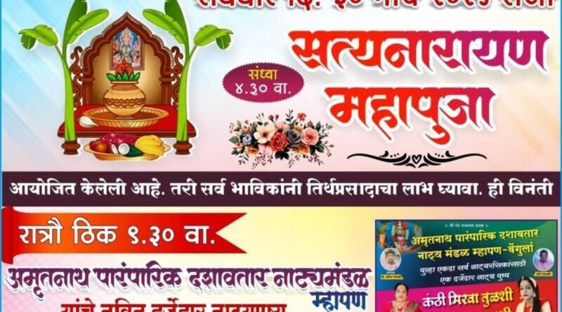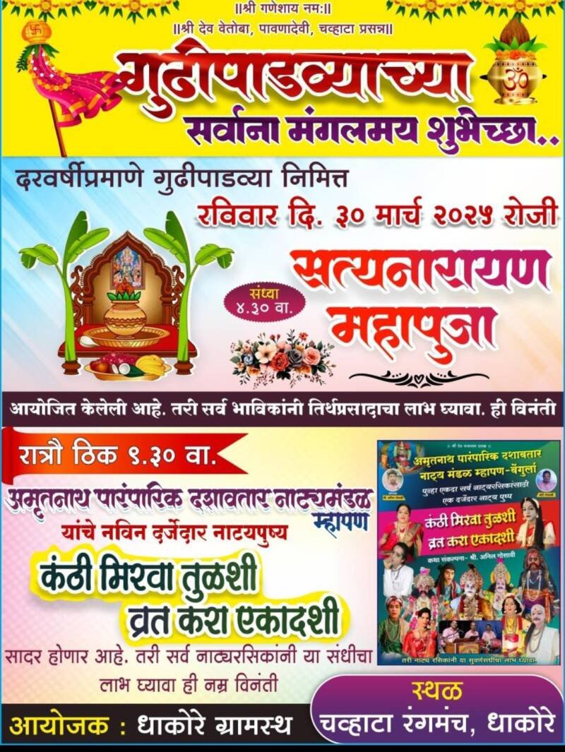 ЁЯО┤рд╕рд╛рд╡рдВрддрд╡рд╛рдбреА, рджрд┐-реиреп:- рдзрд╛рдХреЛрд░реЗ (рдЪрд╡реНрд╣рд╛рдЯрд╛) рдпреЗрдереЗ рдкреНрд░рддрд┐рд╡рд░реНрд╖реА рдкреНрд░рдорд╛рдгреЗ рд░рд╡рд┐рд╡рд╛рд░ рджрд┐рдирд╛рдВрдХ рейреж рдорд╛рд░реНрдЪ реирежреирел рд░реЛрдЬреА, рдЧреБрдвреАрдкрд╛рдбрд╡реНрдпрд╛рдирд┐рдорд┐рддреНрдд рд╕рд╛рдпрдВрдХрд╛рд│реА рек:рейрежрд╡рд╛рдЬрддрд╛ рд╢реНрд░реА рд╕рддреНрдпрдирд╛рд░рд╛рдпрдг рдорд╣рд╛рдкреВрдЬреЗрдЪреЗ рдЖрдпреЛрдЬрди рдХрд░рдгреНрдпрд╛рдд рдЖрд▓реЗ рдЖрд╣реЗ.рдпрд╛рдирд┐рдорд┐рддреНрдд рд░рд╛рддреНрд░реМ реп:рейреж рд╡рд╛рдЬрддрд╛ рдЕрдореГрддрдирд╛рде рдкрд╛рд░рдВрдкрд░рд┐рдХ рджрд╢рд╛рд╡рддрд╛рд░ рдирд╛рдЯреНрдп рдордВрдбрд│, рдореНрд╣рд╛рдкрдг рдпрд╛рдВрдЪрд╛ “рдХрдВрдареА рдорд┐рд░рд╡рд╛ рддреБрд│рд╢реА, рд╡реНрд░рдд рдХрд░рд╛ рдПрдХрд╛рджрд╢реА” рд╣рд╛ рдирд╛рдЯреНрдпрдкреНрд░рдпреЛрдЧ рд╣реЛрдгрд╛рд░ рдЖрд╣реЗ.