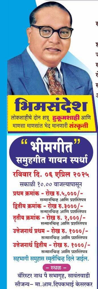 *ЁЯО┤рд╕рд╛рд╡рдВрддрд╡рд╛рдбреА, рджрд┐- режрек:-* рдмреЛрдзреАрд╕рддреНрд╡ рдбреЙ. рдмрд╛рдмрд╛рд╕рд╛рд╣реЗрдм рдЖрдВрдмреЗрдбрдХрд░ рд╕рдорд╛рдЬ рдкреНрд░рдмреЛрдзрди рд╕рдордиреНрд╡рдп рд╕рдорд┐рддреА, рд╕рд╛рд╡рдВрддрд╡рд╛рдбреАрдЪреНрдпрд╛рд╡рд╛рддреАрдиреЗ рдЖрдорджрд╛рд░ рджреАрдкрдХ рджреАрдкрдХ рдХреЗрд╕рд░рдХрд░ рдпрд╛рдВрдЪреНрдпрд╛ рд╕реМрдЬрдиреНрдпрд╛рдиреЗ “рднреАрдордЧреАрдд” рд╕рдореБрд╣рдЧреАрдд рдЧрд╛рдпрди рд╕реНрдкрд░реНрдзрд╛ рд░рд╡рд┐рд╡рд╛рд░ режрем рдПрдкреНрд░рд┐рд▓ рд░реЛрдЬреА рдмреЕрд░рд┐рд╕реНрдЯрд░ рдирд╛рде рдкреИ рд╕рднрд╛рдЧреГрд╣, рд╕рд╛рд╡рдВрддрд╡рд╛рдбреА рдпреЗрдереЗ рдЖрдпреЛрдЬрд┐рдд рдХрд░рдгреНрдпрд╛рдд рдЖрд▓реА рдЖрд╣реЗ.