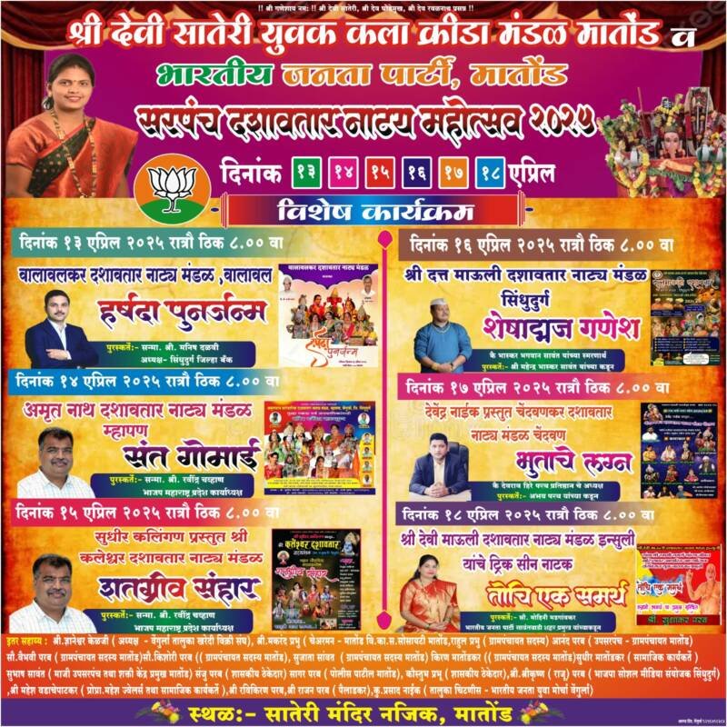 *ЁЯО┤рд╕рд╛рд╡рдВрддрд╡рд╛рдбреА, рджрд┐- режрек:-* рд╢реНрд░реА рджреЗрд╡реА рд╕рд╛рддреЗрд░реА рдпреБрд╡рдХ рдХрд▓рд╛ рдХреНрд░рд┐рдбрд╛ рдордВрдбрд│ рдорд╛рддреЛрдВрдб рд╡ рднрд╛рд░рддреАрдп рдЬрдирддрд╛ рдкрд╛рд░реНрдЯреА рдорд╛рддреЛрдВрдб рд╕рд╛рддреЗрд░реА рдордВрджрд┐рд░ рдирдЬрд┐рдХ рдорд╛рддреЛрдВрдб рдпреЗрдереЗ резрей рддреЗ резрео рдПрдкреНрд░рд┐рд▓ рд░реЛрдЬреА рд╕рд░рдкрдВрдЪ рджрд╢рд╛рд╡рддрд╛рд░ рдирд╛рдЯреНрдпрдорд╣реЛрддреНрд╕рд╡ рд╣реЛрдгрд╛рд░ рдЖрд╣реЗ.