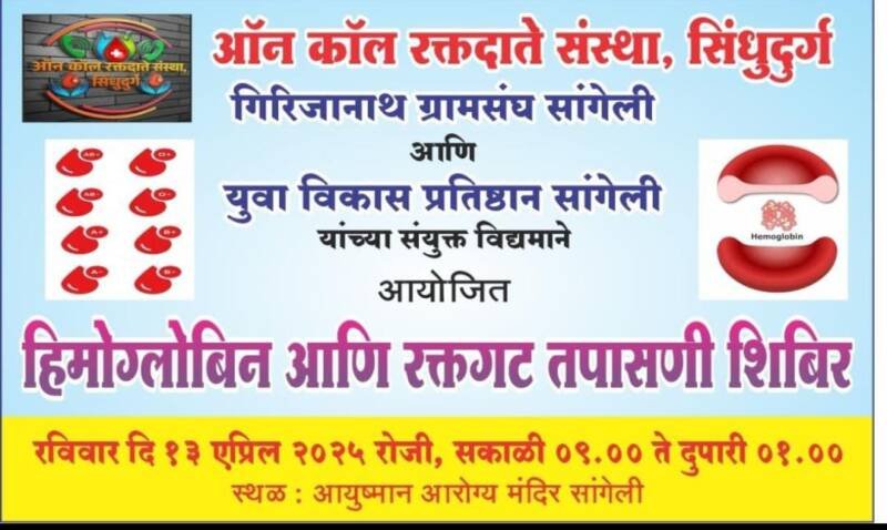 рдпрд╛рдЪ рдХрд╛рд░реНрдпрд╛рдЪрд╛ рдПрдХ рднрд╛рдЧ рдореНрд╣рдгреВрди рдпреЗрддреНрдпрд╛ рд░рд╡рд┐рд╡рд╛рд░реА рджрд┐. резрей рдПрдкреНрд░рд┐рд▓ реирежреирел рд░реЛрдЬреА рд╕рдХрд╛рд│реА реп:режреж рддреЗ рджреБрдкрд╛рд░реА рез:режреж рд╡рд╛рдЬреЗрдкрд░реНрдпрдВрдд рд╕рд╛рдВрдЧреЗрд▓реА рдЧрд╛рд╡рд╛рдд “рдЧрд┐рд░реАрдЬрд╛рдирд╛рде рдЧреНрд░рд╛рдорд╕рдВрдШ, рд╕рд╛рдВрдЧреЗрд▓реА” рдЖрдгрд┐ “рдпреБрд╡рд╛ рд╡рд┐рдХрд╛рд╕ рдкреНрд░рддрд┐рд╖реНрдард╛рди, рд╕рд╛рдВрдЧреЗрд▓реА” рдпрд╛рдВрдЪреНрдпрд╛ рд╕рдВрдпреБрдХреНрдд рд╡рд┐рджреНрдпрдорд╛рдиреЗ рдЖрдпреБрд╖реНрдпрдорд╛рди рдЖрд░реЛрдЧреНрдп рдордВрджрд┐рд░, рд╕рд╛рдВрдЧреЗрд▓реА рдпреЗрдереЗ рд╣рд┐рдореЛрдЧреНрд▓реЛрдмрд┐рди рд╡ рд░рдХреНрддрдЧрдЯ рддрдкрд╛рд╕рдгреА рд╢рд┐рдмрд┐рд░рд╛рдЪреЗ рдЖрдпреЛрдЬрди рдХрд░рдгреНрдпрд╛рдд рдЖрд▓реЗ рдЖрд╣реЗ.