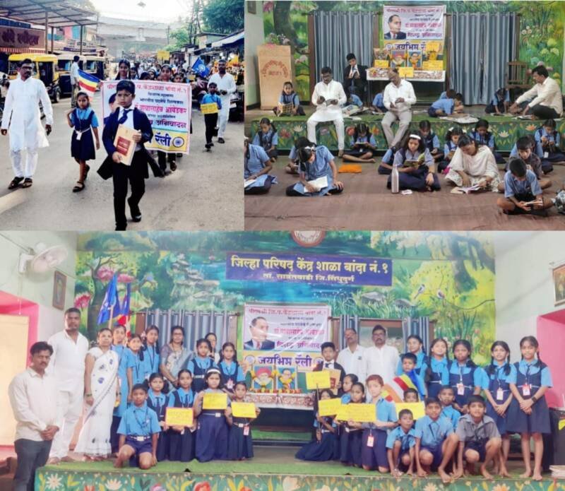 рдХрд╛рд░реНрдпрдХреНрд░рдорд╛рдЪреНрдпрд╛ рд╕реБрд░рд╡рд╛рддреАрд▓рд╛ рд╡рд┐рджреНрдпрд╛рд░реНрдереНрдпрд╛рдВрдиреА рд╕рдВрд╡рд┐рдзрд╛рдирд╛рдЪреНрдпрд╛ рдЙрджреНрджреЗрд╢рд┐рдХреЗрдЪреЗ рд╕рд╛рдореБрд╣рд┐рдХ рд╡рд╛рдЪрди рдХрд░рдгреНрдпрд╛рдд рдЖрд▓реЗ.рдпрд╛рд╡реЗрд│реА рд╡рд┐рджреНрдпрд╛рд░реНрдереНрдпрд╛рдВрдиреА рд╡рд╛рдЬрдд рдЧрд╛рдЬрдд рд╡ рд╡рд┐рд╡рд┐рдз рдШреЛрд╖рдгрд╛ рджреЗрдд рдмрд╛рдВрджрд╛ рдмрд╛рдЬрд╛рд░рдкреЗрдарддреВрди рдЬрдпрднреАрдо рд░реЕрд▓реА рдХрд╛рдврд▓реА.рдпрд╛рдордзреНрдпреЗ рд╢рд╛рд│реЗрддреАрд▓ рд╡рд┐рджреНрдпрд╛рд░реНрдереА рд╣рд░реНрд╖рдж рд╕реБрд╢рд╛рдВрдд рдард╛рдХреВрд░ рдпрд╛рдиреЗ рдбреЙ.рдмрд╛рдмрд╛рд╕рд╛рд╣реЗрдмрд╛рдВрдЪреА рд╕рд╛рдХрд╛рд░рд▓реЗрд▓реА рд╡реЗрд╢рднреВрд╖рд╛ рд▓рдХреНрд╖рд╡реЗрдзреА рдард░рд▓реА.