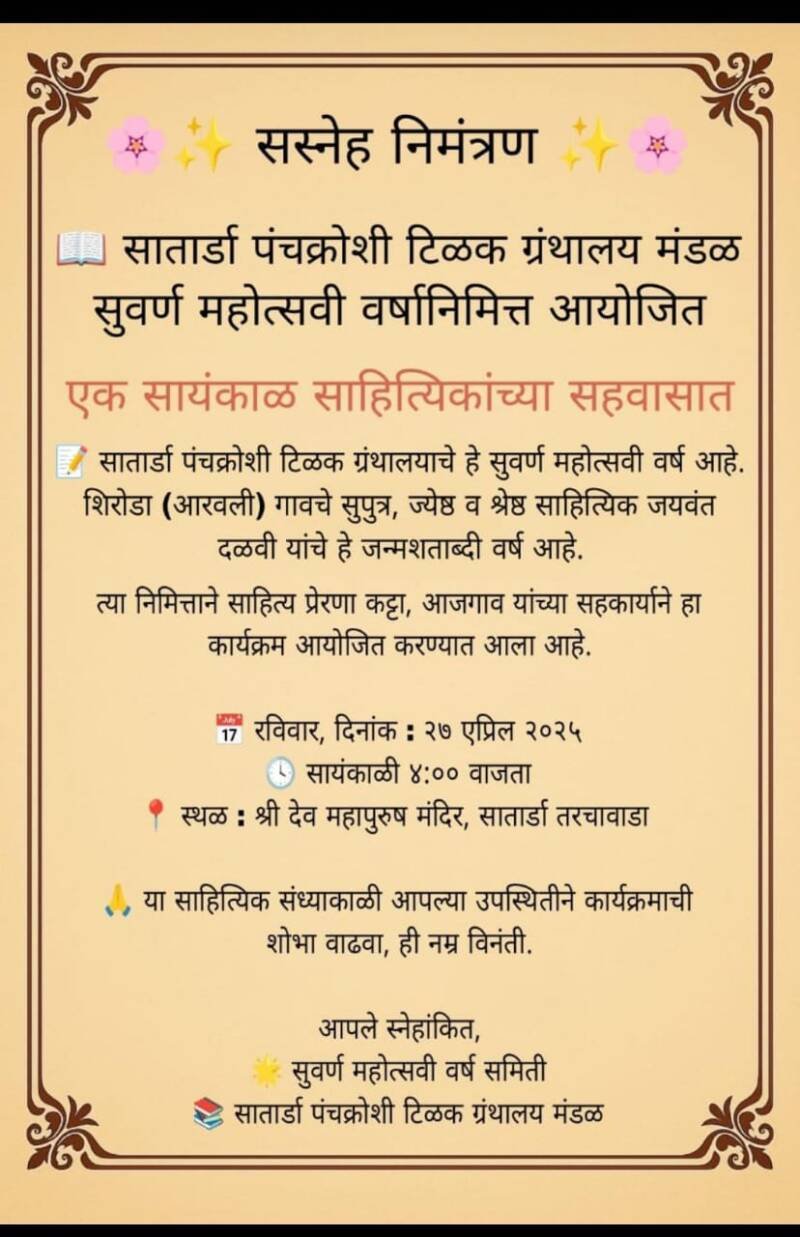 рддрд░реА рдпрд╛ рд╕рд╛рд╣рд┐рддреНрдпрд┐рдХ рд╕рдВрдзреНрдпрд╛рдХрд╛рд│реА рдХрд╛рд░реНрдпрдХреНрд░рдорд╛рд╕рд╛рдареА рд╕рд░реНрд╡рд╛рдВрдиреА рдЙрдкрд╕реНрдерд┐рдд рд░рд╛рд╣рдгреНрдпрд╛рдЪреЗ рдЖрд╡рд╛рд╣рди,рд╕реБрд╡рд░реНрдг рдорд╣реЛрддреНрд╕рд╡реА рд╡рд░реНрд╖ рд╕рдорд┐рддреА, рд╕рд╛рддрд╛рд░реНрдбрд╛, рдкрдВрдЪрдХреНрд░реЛрд╢реА рдЯрд┐рд│рдХ рдЧреНрд░рдВрдерд╛рд▓рдп рдордВрдбрд│ рдпрд╛рдВрдиреА рдХреЗрд▓реЗ рдЖрд╣реЗ.