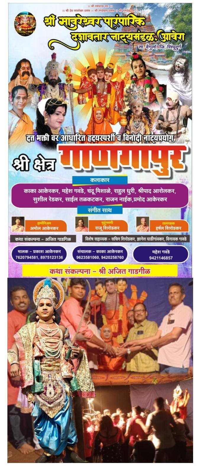 ЁЯО┤рд╕рд╛рд╡рдВрддрд╡рд╛рдбреА, рджрд┐-резреж:- рд╡реЗрдВрдЧреБрд░реНрд▓рд╛ рддрд╛рд▓реБрдХреНрдпрд╛рддреАрд▓ рдЖрд╡реЗрд░реЗ рдпреЗрдереАрд▓ рд╢реНрд░реА рд╕рд╛рд╡рд░реЗрд╢реНрд╡рд░ рджрд╢рд╛рд╡рддрд╛рд░ рдирд╛рдЯреНрдпрдордВрдбрд│ (рд╕рдВрдЪрд╛рд▓рдХ рдХрд╛рдХрд╛ рдЖрдХреЗрд░рдХрд░) рдпрд╛ рдирд╛рдЯреНрдпрдордВрдбрд│рд╛рдЪрд╛ ‘рд╢реНрд░реА рдХреНрд╖реЗрддреНрд░ рдЧрд╛рдгрдЧрд╛рдкреВрд░ рдпрд╛ рджрддреНрддрднрдХреНрддреАрд╡рд░ рдЖрдзрд╛рд░рд┐рдд рдкреНрд░рдмреЛрдзрдирд╛рддреНрдордХ рд╡ рд╕рдзреНрдпрд╛ рдмрд╣реБрдЪрд░реНрдЪрд┐рдд рдЕрд╕рд▓реЗрд▓реНрдпрд╛ рдирд╛рдЯреНрдпрдкреНрд░рдпреЛрдЧрд╛рд▓рд╛ рдкреНрд░реЗрдХреНрд╖рдХрд╛рдВрдЪрд╛ рдЙрджрдВрдб рдкреНрд░рддрд┐рд╕рд╛рдж рдорд┐рд│рдд рдЖрд╣реЗ. реиреж рдПрдкреНрд░рд┐рд▓ рд░реЛрдЬреА рдпрд╛ рдирд╛рдЯреНрдпрдкреНрд░рдпреЛрдЧрд╛рдЪрд╛ рдкрд╣рд┐рд▓рд╛ рдкреНрд░рдпреЛрдЧ рдЭрд╛рд▓рд╛ рдЕрд╕реВрди рдЖрддрд╛рдкрд░реНрдпрдВрдд рдЕрд╡рдШреНрдпрд╛ реиреж рджрд┐рд╡рд╕рд╛рдд резрен рдкреНрд░рдпреЛрдЧ рдЭрд╛рд▓реЗ рдЖрд╣реЗрдд.