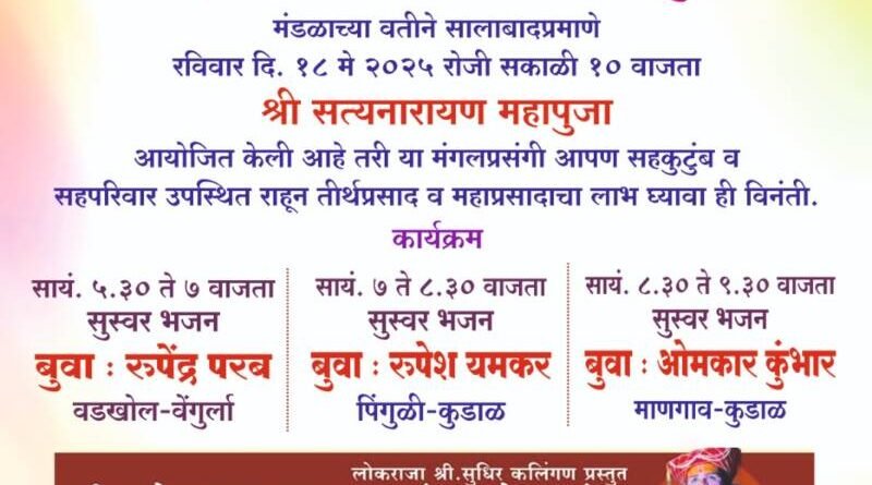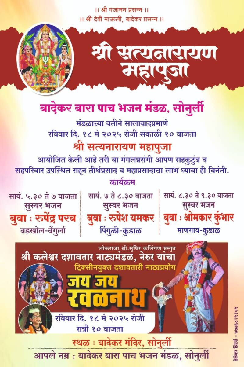 ЁЯО┤рд╕рд╛рд╡рдВрддрд╡рд╛рдбреА, рджрд┐-резрео:- рдмрд╛рджреЗрдХрд░ рдмрд╛рд░рд╛рдкрд╛рдЪ рднрдЬрди рдордВрдбрд│, рд╕реЛрдиреБрд░реНрд▓реА рдмрд╛рджреЗрдХрд░ рдордВрджрд┐рд░рд╛рдд рдЖрдЬ рд░рд╡рд┐рд╡рд╛рд░ резрео рдореЗ рд░реЛрдЬреА рд╡рд┐рд╡рд┐рдз рдзрд╛рд░реНрдорд┐рдХ рдХрд╛рд░реНрдпрдХреНрд░рдорд╛рдВрдЪреЗ рдЖрдпреЛрдЬрди рдХрд░рдгреНрдпрд╛рдд рдЖрд▓реЗ рдЖрд╣реЗ.рд╕рдХрд╛рд│реА резреж рд╡рд╛рдЬрддрд╛ рд╢реНрд░реА рд╕рддреНрдпрдирд╛рд░рд╛рдпрдг рдорд╣рд╛рдкреВрдЬрд╛ рддреНрдпрд╛рдирдВрддрд░ рддреАрд░реНрдердкреНрд░рд╕рд╛рдж рд╡ рдорд╣рд╛рдкреНрд░рд╕рд╛рдж,рд╕рд╛рдпрдВрдХрд╛рд│реА рел .рейреж рддреЗ рен рд╡рд╛рдЬрддрд╛ рдмреБрд╡рд╛ – рд░реБрдкреЗрдВрджреНрд░ рдкрд░рдм,рд░реБрдкреЗрд╢ рдпрдордХрд░,рдУрдордХрд╛рд░ рдХреБрдВрднрд╛рд░ рдпрд╛рдВрдЪреЗ рд╕реБрд╢реНрд░рд╛рд╡реНрдп рднрдЬрдирд╛рдЪрд╛ рдХрд╛рд░реНрдпрдХреНрд░рдо,рд░рд╛рддреНрд░реА резреж рд╡рд╛рдЬрддрд╛ рдХрд▓реЗрд╢реНрд╡рд░ рджрд╢рд╛рд╡рддрд╛рд░ рдирд╛рдЯреНрдпрдордВрдбрд│ рдиреЗрд░реБрд░ рдпрд╛рдВрдЪрд╛ рдЯреНрд░рд┐рдХрд╕рд┐рдирдпреБрдХреНрдд тАШ рдЬрдп рдЬрдп рд░рд╡рд│рдирд╛рде тАШ рд╣рд╛ рдирд╛рдЯреНрдпрдкреНрд░рдпреЛрдЧ рд╣реЛрдгрд╛рд░ рдЖрд╣реЗ.