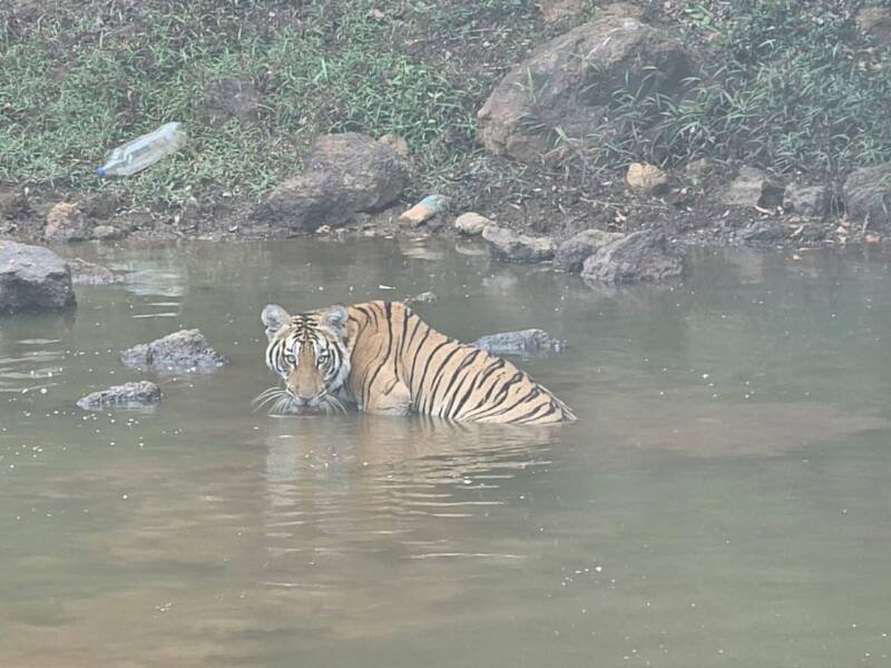 चौकुळ येथे रस्त्यानजिक दिवसाढवळ्या पट्टेरी वाघाचे दर्शन.