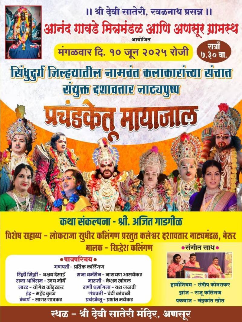 *ЁЯО┤ рд╡реЗрдВрдЧреБрд░реНрд▓рд╛, рджрд┐- резреж:-* рдЕрдгрд╕реВрд░ рдпреЗрдереАрд▓ рд╢реНрд░реА рджреЗрд╡реА рд╕рд╛рддреЗрд░реА рдордВрджрд┐рд░ рдпреЗрдереЗ рдордВрдЧрд│рд╡рд╛рд░ рджрд┐рдирд╛рдВрдХ резреж рдЬреВрди реирежреирел рд░реЛрдЬреА рд░рд╛рддреНрд░реМ рдареАрдХ рен:рейреж рд╡рд╛рдЬрддрд╛, рдЖрдирдВрдж рдЧрд╛рд╡рдбреЗ рдорд┐рддреНрд░рдордВрдбрд│ рдЖрдгрд┐ рдЕрдгрд╕реВрд░ рдЧреНрд░рд╛рдорд╕реНрде рдЖрдпреЛрдЬрд┐рдд рд╕рд┐рдВрдзреБрджреБрд░реНрдЧ рдЬрд┐рд▓реНрд╣реНрдпрд╛рддреАрд▓ рдирд╛рдорд╡рдВрдд рдХрд▓рд╛рдХрд╛рд░рд╛рдВрдЪреНрдпрд╛ рд╕рдВрдЪрд╛рдд,рд╕рдВрдпреБрдХреНрдд рджрд╢рд╛рд╡рддрд╛рд░ “рдкреНрд░рдЪрдВрдбрдХреЗрддреВ рдорд╛рдпрд╛рдЬрд╛рд▓” рд╣рд╛ рджрд╢рд╛рд╡рддрд╛рд░реА рдирд╛рдЯреНрдп рдкреНрд░рдпреЛрдЧ рд╣реЛрдгрд╛рд░ рдЖрд╣реЗ.