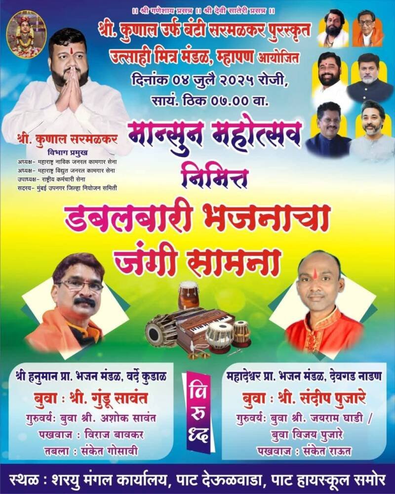 ЁЯО┤рд╡реЗрдВрдЧреБрд░реНрд▓рд╛, рджрд┐-реиреж:- рд╢реНрд░реА рдХреБрдгрд╛рд▓ рдЙрд░реНрдл рдмрдВрдЯреА рд╕рд░рдорд│рдХрд░ рдкреБрд░рд╕реНрдХреГрдд рд╡ рдЙрддреНрд╕рд╛рд╣реА рдорд┐рддреНрд░рдордВрдбрд│ рдореНрд╣рд╛рдкрдг рдЖрдпреЛрдЬрд┐рдд рдорд╛рдиреНрд╕реВрди рдорд╣реЛрддреНрд╕рд╡рд╛рдЪреНрдпрд╛ рдирд┐рдорд┐рддреНрддрд╛рдиреЗ рджрд┐. рек рдЬреБрд▓реИ реирежреирел рд░реЛрдЬреА рд╕рд╛рдпрдВрдХрд╛рд│реА рен рд╡рд╛рдЬрддрд╛ рд╢рд░рдпреВ рдордВрдЧрд▓ рдХрд╛рд░реНрдпрд╛рд▓рдп, рдкрд╛рдЯ (рдкрд╛рдЯ рд╣рд╛рдпрд╕реНрдХреВрд▓ рд╕рдореЛрд░) рдпреЗрдереЗ рдбрдмрд▓рдмрд╛рд░реАрдЪреНрдпрд╛ рдЬрдВрдЧреА рд╕рд╛рдордиреНрдпрд╛рдЪреЗ рдЖрдпреЛрдЬрди рдХрд░рдгреНрдпрд╛рдд рдЖрд▓реЗ рдЖрд╣реЗ. рд╕рд┐рдВрдзреБрджреБрд░реНрдЧрд╛рддреАрд▓ рджреЛрди рдирд╛рдорд╛рдВрдХрд┐рдд рдмреБрд╡рд╛ рд╢реНрд░реА рдЧреБрдВрдбреВ рд╕рд╛рд╡рдВрдд рд╡ рдмреБрд╡рд╛ рд╢реНрд░реА рд╕рдВрджреАрдк рдкреБрдЬрд╛рд░реЗ рдпрд╛рдВрдЪреНрдпрд╛рдд рд╣рд╛ рдбрдмрд▓рдмрд╛рд░реАрдЪрд╛ рд╕рд╛рдордирд╛ рд░рдВрдЧрдгрд╛рд░ рдЖрд╣реЗ. рджреЛрдиреНрд╣реА рдмреБрд╡рд╛рдВрдЪрд╛ рдореЛрдард╛ рдЪрд╛рд╣рддрд╛ рд╡рд░реНрдЧ рд╕рдВрдкреВрд░реНрдг рд╕рд┐рдВрдзреБрджреБрд░реНрдЧ, рд░рддреНрдирд╛рдЧрд┐рд░реАрд╕рд╣ рдореБрдВрдмрдИ рдпреЗрдереЗ рдЖрд╣реЗ. рд╢реНрд░реА рдмрдВрдЯреА рд╕рд░рдорд│рдХрд░ рд╣реЗ рд╕рд▓рдЧ рем рд╡рд░реНрд╖реЗ рдореНрд╣рд╛рдкрдг рдордзреНрдпреЗ рдорд╛рдиреНрд╕реВрди рдорд╣реЛрддреНрд╕рд╡ рдкреБрд░рд╕реНрдХреГрдд рдХрд░рдд рдЖрд╣реЗрдд. рджрд╢рд╛рд╡рддрд╛рд░, рдбрдмрд▓рдмрд╛рд░реА рдЕрд╢рд╛ рдХрд╛рд░реНрдпрдХреНрд░рдорд╛рдВрдЪреЗ рдЖрдпреЛрдЬрди рдХрд░реВрди рддреЗ рд░рд╕рд┐рдХрд╛рдВрдЪреЗ рдордиреЛрд░рдВрдЬрди рдХрд░рдд рдЖрд╣реЗрдд.