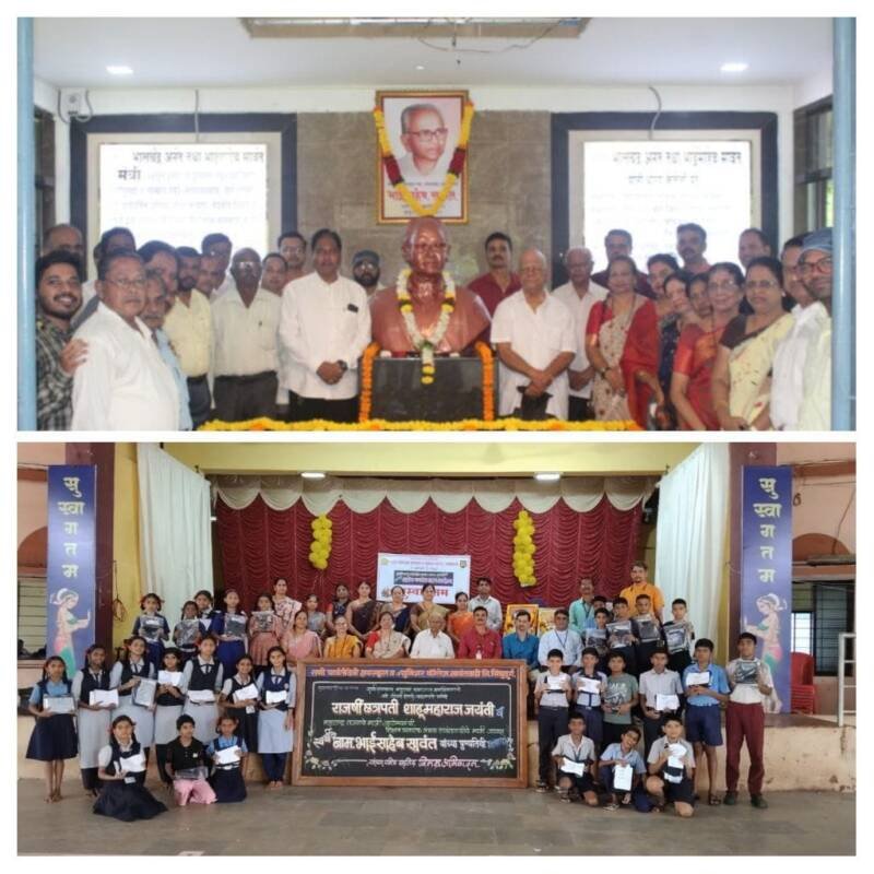 рд░рд╛рдЬрд░реНрд╖реА рд╢рд╛рд╣реВ рдорд╣рд╛рд░рд╛рдЬ рд╡ рднрд╛рдИрд╕рд╛рд╣реЗрдм рд╕рд╛рд╡рдВрдд рдпрд╛рдВрдЪреНрдпрд╛ рдкреНрд░рддрд┐рдореЗрдЪреЗ рдкреВрдЬрди рдХрд░реВрди рдХрд╛рд░реНрдпрдХреНрд░рдорд╛рд▓рд╛ рд╕реБрд░реБрд╡рд╛рдд рдЭрд╛рд▓реА. рдпрд╛ рдЬрдпрдВрддреА рд╡ рдкреБрдгреНрдпрддрд┐рдереАрдЪреЗ рдФрдЪрд┐рддреНрдп рд╕рд╛рдзреВрди рдорд╛рдиреНрдпрд╡рд░рд╛рдВрдЪреНрдпрд╛ рд╣рд╕реНрддреЗ рдЧрд░рдЬреВ рд╡ рд╣реЛрддрдХрд░реВ рдЕрд╢рд╛ реирео рд╡рд┐рджреНрдпрд╛рд░реНрдереА-рд╡рд┐рджреНрдпрд╛рд░реНрдерд┐рдиреАрдВрдирд╛ рдореЛрдлрдд рдЧрдгрд╡реЗрд╢ рд╡рд╛рдЯрдк рдХрд░реВрди рд╡рд┐рджреНрдпрд╛рд░реНрдереНрдпрд╛рдВрдирд╛ рд╢реБрднреЗрдЪреНрдЫрд╛ рджреЗрдгреНрдпрд╛рдд рдЖрд▓реНрдпрд╛. рдпрд╛рдкреИрдХреА рдХрд╛рд╣реА рдЧрдгрд╡реЗрд╢ рд╢рд╛рд│реЗрдЪреНрдпрд╛ рд╕реЗрд╡рд╛рдирд┐рд╡реГрддреНрдд рд╢рд┐рдХреНрд╖рд┐рдХрд╛ рд╕реБрдЦрджрд╛ рдореНрд╣рд╛рдкрдгрдХрд░, рд╕реЗрд╡рд╛рдирд┐рд╡реГрддреНрдд рд╢рд┐рдХреНрд╖рд┐рдХрд╛ рд╕реБрдирд┐рддрд╛ рдкреЛрд░реЛрдм рдЖрдгрд┐ рдорд╛рдЬреА рд╡рд┐рджреНрдпрд╛рд░реНрдереА рд╡рд┐рдареНрдард▓ рдмрд╛рд│рдХреГрд╖реНрдг рдирд╛рдИрдХ рдпрд╛рдВрдиреА рдкреБрд░рд╕реНрдХреГрдд рдХреЗрд▓реЗ рд╣реЛрддреЗ. рдпрд╛рд╡реЗрд│реА рд░рд╛рдЬрд░реНрд╖реА рд╢рд╛рд╣реВ рдорд╣рд╛рд░рд╛рдЬ рдпрд╛рдВрдЪреНрдпрд╛ рдХрд╛рд░реНрдпрдХрд░реНрддреГрддреНрд╡рд╛рд╡рд┐рд╖рдпреА рд╕рд╣рд╛рдпреНрдпрдХ рд╢рд┐рдХреНрд╖рдХ рдХрд╢реЗрд│реАрдХрд░ рд╡ рд╕реНрд╡. рднрд╛рдИрд╕рд╛рд╣реЗрдм рд╕рд╛рд╡рдВрдд рдпрд╛рдВрдЪреНрдпрд╛ рдХрд╛рд░реНрдпрдХрд░реНрддреГрддреНрд╡рд╛рд╡рд┐рд╖рдпреА рджреЗрд╕рд╛рдИ рдореЕрдбрдо рдпрд╛рдВрдиреА рд╡рд┐рджреНрдпрд╛рд░реНрдереНрдпрд╛рдВрдирд╛ рдорд╛рд╣рд┐рддреА рджрд┐рд▓реА. рдпрд╛рдкреНрд░рд╕рдВрдЧреА рд╡реНрдпрд╛рд╕рдкреАрдард╛рд╡рд░ рд╢рд┐рдХреНрд╖рдг рдкреНрд░рд╕рд╛рд░рдХ рдордВрдбрд│ рд╕рд╛рд╡рдВрддрд╡рд╛рдбреАрдЪреЗ рд╡рд┐рджреНрдпрдорд╛рди рд╕рдЪрд┐рд╡ рдЖрдгрд┐ рдорд╛рдЬреА рдореБрдЦреНрдпрд╛рдзреНрдпрд╛рдкрдХ рд╡реНрд╣реА. рдмреА. рдирд╛рдИрдХ, рдкреНрд░рд╢рд╛рд▓реЗрдЪреНрдпрд╛ рдореБрдЦреНрдпрд╛рдзреНрдпрд╛рдкрд┐рдХрд╛ рд╕рдВрдкреНрд░рд╡реА рдХрд╢рд╛рд│реАрдХрд░ , рдЙрдкрдореБрдЦреНрдпрд╛рдзреНрдпрд╛рдкрдХ рдПрд╕. рдПрди. рдкрд╛рдЯреАрд▓ рддрд╕реЗрдЪ рдЧрдгрд╡реЗрд╢ рджрд╛рддреЗ рд╕реЗрд╡рд╛рдирд┐рд╡реГрддреНрдд рд╢рд┐рдХреНрд╖рд┐рдХрд╛ рд╕реБрдЦрджрд╛ рдореНрд╣рд╛рдкрдгрдХрд░, рд╢рд┐рдХреНрд╖рдХ рд╢рд┐рдХреНрд╖рдХреЗрддрд░ рдХрд░реНрдордЪрд╛рд░реА рдЖрджреА рдЙрдкрд╕реНрдерд┐рдд рд╣реЛрддреЗ. рддрд╕реЗрдЪ рд▓реЛрдХрдиреЗрддреЗ рд╕реНрд╡. рднрд╛рдИрд╕рд╛рд╣реЗрдм рд╕рд╛рд╡рдВрдд рдпрд╛рдВрдЪреНрдпрд╛ рдкреБрдгреНрдпрддрд┐рдереАрдирд┐рдорд┐рддреНрдд рдорд╛рдЬрдЧрд╛рд╡ рдпреЗрдереАрд▓ рд╕рдорд╛рдзреАрд╕реНрдерд│реА рд╕рдХрд╛рд│реА рд╢рд┐рдХреНрд╖рдг рдкреНрд░рд╕рд╛рд░рдХ рдордВрдбрд│ рд╕рд╛рд╡рдВрддрд╡рд╛рдбреА рдЕрдзреНрдпрдХреНрд╖ рд╡рд┐рдХрд╛рд╕ рд╕рд╛рд╡рдВрдд, рдЙрдкрд╛рдзреНрдпрдХреНрд╖ рдбреЙ. рджрд┐рдиреЗрд╢ рдирд╛рдЧрд╡реЗрдХрд░ , рд╕рдЪрд┐рд╡ рд╡реНрд╣реА. рдмреА. рдирд╛рдИрдХ, рдЦрдЬрд┐рдирджрд╛рд░ рд╕реА. рдПрд▓. рдир