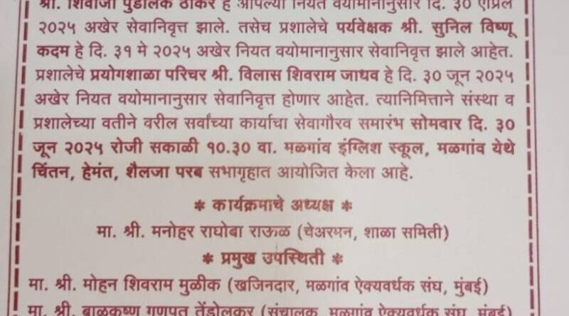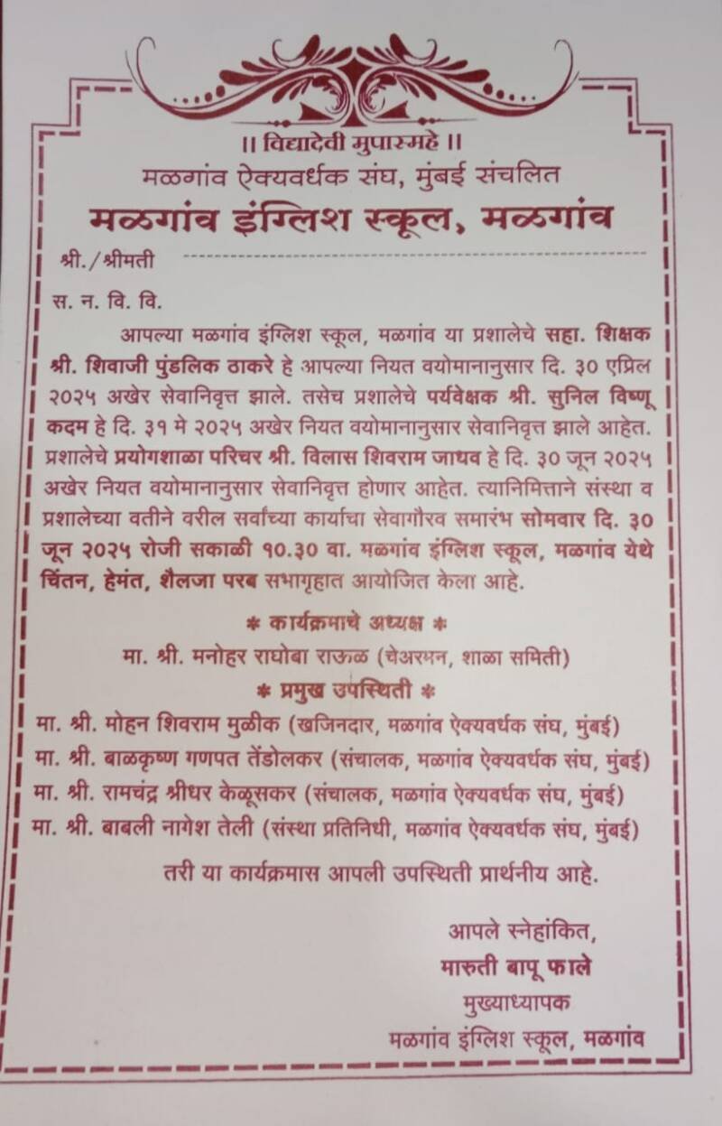 рдорд│рдЧрд╛рд╡ рдЗрдВрдЧреНрд▓рд┐рд╢ рд╕реНрдХреВрд▓ рдорд│рдЧрд╛рд╡ рдкреНрд░рд╢рд╛рд▓реЗрдЪреЗ рд╕рд╣рд╛рдпреНрдпрдХ рд╢рд┐рдХреНрд╖рдХ рд╢рд┐рд╡рд╛рдЬреА рдкреБрдВрдбрд▓рд┐рдХ рдард╛рдХрд░реЗ рд╣реЗ рдЖрдкрд▓реНрдпрд╛ рдирд┐рдпрдд рд╡рдпреЛрдорд╛рдирд╛рдиреБрд╕рд╛рд░ рейреж рдПрдкреНрд░рд┐рд▓ рд░реЛрдЬреА, рдкреНрд░рд╢рд╛рд▓реЗрдЪреЗ рдкрд░реНрдпрд╡реЗрдХреНрд╖рдХ рд╕реБрдиреАрд▓ рд╡рд┐рд╖реНрдгреВ рдХрджрдо рд╣реЗ рейрез рдореЗ рд░реЛрдЬреА рдирд┐рдпрдд рд╡рдпреЛрдорд╛рдирд╛рдиреБрд╕рд╛рд░ рд╕реЗрд╡рд╛рдирд┐рд╡реГрддреНрдд рдЭрд╛рд▓реЗ рдЖрд╣реЗрдд. рддрд░ рдкреНрд░рд╢рд╛рд▓реЗрдЪреЗ рдкреНрд░рдпреЛрдЧрд╢рд╛рд│рд╛ рдкрд░рд┐рдЪрд░ рд╡рд┐рд▓рд╛рд╕ рд╢рд┐рд╡рд░рд╛рдо рдЬрд╛рдзрд╡ рд╣реЗ рейреж рдЬреВрди рд░реЛрдЬреА рдирд┐рдпрдд рд╡рдпреЛрдорд╛рдирд╛рдиреБрд╕рд╛рд░ рд╕реЗрд╡рд╛рдирд┐рд╡реГрддреНрдд рд╣реЛрдгрд╛рд░ рдЖрд╣реЗрдд. рддреНрдпрд╛рдирд┐рдорд┐рддреНрддрд╛рдиреЗ рд╕рдВрд╕реНрдерд╛ рд╡ рдкреНрд░рд╢рд╛рд▓реЗрдЪреНрдпрд╛рд╡рддреАрдиреЗ рд╡рд░реАрд▓ рд╕рд░реНрд╡рд╛рдВрдЪреНрдпрд╛ рдХрд╛рд░реНрдпрд╛рдЪрд╛ рд╕реЗрд╡рд╛рдЧреМрд░рд╡ рд╕рдорд╛рд░рдВрдн рейреж рдЬреВрди рд░реЛрдЬреА рд╕рдХрд╛рд│реА резреж.рейреж рд╡рд╛рдЬрддрд╛ рдкреНрд░рд╢рд╛рд▓реЗрдЪреНрдпрд╛ рдЪрд┐рдВрддрди, рд╣реЗрдордВрдд, рд╢реИрд▓рдЬрд╛ рдкрд░рдм рд╕рднрд╛рдЧреГрд╣рд╛рдд рдЖрдпреЛрдЬрд┐рдд рдХрд░рдгреНрдпрд╛рдд рдЖрд▓рд╛ рдЖрд╣реЗ. рдХрд╛рд░реНрдпрдХреНрд░рдорд╛рд▓рд╛ рдЕрдзреНрдпрдХреНрд╖ рдореНрд╣рдгреВрди рд╢рд╛рд│рд╛ рд╡реНрдпрд╡рд╕реНрдерд╛рдкрди рд╕рдорд┐рддреА рдЕрдзреНрдпрдХреНрд╖ рдордиреЛрд╣рд░ рд░рд╛рдКрд│ рддрд░ рдкреНрд░рдореБрдЦ рдкрд╛рд╣реБрдгреЗ рдорд│рдЧрд╛рд╡ рдРрдХреНрдпрд╡рд░реНрдзрдХ рд╕рдВрдШ рдореБрдВрдмрдИрдЪреЗ рдЦрдЬрд┐рдирджрд╛рд░ рдореЛрд╣рди рдореБрд│реАрдХ, рд╕рдВрдЪрд╛рд▓рдХ рдмрд╛рд│рдХреГрд╖реНрдг рддреЗрдВрдбреЛрд▓рдХрд░, рд╕рдВрдЪрд╛рд▓рдХ рд░рд╛рдордЪрдВрджреНрд░ рдХреЗрд│реБрд╕рдХрд░, рд╕рдВрд╕реНрдерд╛ рдкреНрд░рддрд┐рдирд┐рдзреА рдмрд╛рдмрд▓реА рддреЗрд▓реА рдЖрджреА рдорд╛рдиреНрдпрд╡рд░ рдЙрдкрд╕реНрдерд┐рдд рд░рд╛рд╣рдгрд╛рд░ рдЖрд╣реЗрдд. рдпрд╛ рд╕реЗрд╡рд╛ рдЧреБрдгрдЧреМрд░рд╡ рдХрд╛рд░реНрдпрдХреНрд░рдорд╛рд▓рд╛ рдорд╛рдЬреА рд╢рд┐рдХреНрд╖рдХ, рдкрд╛рд▓рдХ, рдорд╛рдЬреА рд╡рд┐рджреНрдпрд╛рд░реНрдереА рдпрд╛рдВрдиреА рдЙрдкрд╕реНрдерд┐рдд рд░рд╣рд╛рд╡реЗ, рдЕрд╕реЗ рдЖрд╡рд╛рд╣рди рдкреНрд░рд╢рд╛рд▓реЗрдЪреЗ рдореБрдЦреНрдпрд╛рдзреНрдпрд╛рдкрдХ рдорд╛рд░реБрддреА рдлрд╛рд▓реЗ рдпрд╛рдВрдиреА рдХреЗрд▓реЗ рдЖрд╣реЗ.