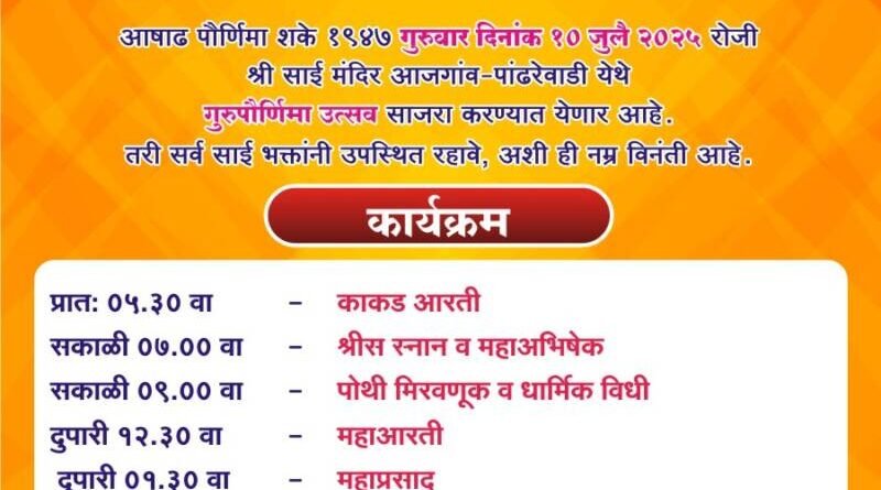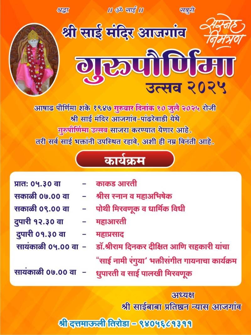 ЁЯО┤рд╕рд╛рд╡рдВрддрд╡рд╛рдбреА, рджрд┐-режреп:– рдЖрдЬрдЧрд╛рд╡ – рдкрд╛рдВрдврд░реЗрд╡рд╛рдбреА рдпреЗрдереАрд▓ рд╢реНрд░реА рд╕рд╛рдИ рдордВрджрд┐рд░рд╛рдд рдЧреБрд░реБрд╡рд╛рд░ рджрд┐рдирд╛рдВрдХ резреж рдЬреБрд▓реИ реирежреирел рд░реЛрдЬреА рдЧреБрд░реБрдкреМрд░реНрдгрд┐рдорд╛ рдЙрддреНрд╕рд╡рд╛рдЪреЗ рдЖрдпреЛрдЬрди рдХрд░рдгреНрдпрд╛рдд рдЖрд▓реЗ рдЕрд╕реВрди, рдпрд╛ рджрд┐рд╡рд╢реА рдкрд╣рд╛рдЯреЗ рел:рейреж рд╡рд╛рдЬрддрд╛ рдХрд╛рдХрдб рдЖрд░рддреА,рд╕рдХрд╛рд│реА рен:режреж рд╡рд╛рдЬрддрд╛ ‘рд╢реНрд░реА’ рд╕ рд╕реНрдирд╛рди рд╡ рдорд╣рд╛рдЕрднрд┐рд╖реЗрдХ, рд╕.реп:режреж рдкреЛрдереА рдорд┐рд░рд╡рдгреВрдХ рд╡ рдзрд╛рд░реНрдорд┐рдХ рд╡рд┐рдзреА, рджреБ.резреи:рейреж рд╡рд╛рдЬрддрд╛ рдорд╣рд╛рдЖрд░рддреА, рджреБ.рез:рейреж рд╡рд╛.рдорд╣рд╛рдкреНрд░рд╕рд╛рдж, рд╕рд╛рдпрдВрдХрд╛рд│реА рел:режреж рдбреЙ .рд╢реНрд░реАрд░рд╛рдо рджрд┐рдирдХрд░ рджреАрдХреНрд╖рд┐рдд рдЖрдгрд┐ рд╕рд╣рдХрд╛рд░реА рдпрд╛рдВрдЪрд╛ ” рд╕рд╛рдИ рдирд╛рдореА рд░рдВрдЧреБрдпрд╛”рднрдХреНрддреА рд╕рдВрдЧреАрдд рдЧрд╛рдпрдирд╛рдЪрд╛ рдХрд╛рд░реНрдпрдХреНрд░рдо, рд╕рдВрдзреНрдпрд╛.рен:режреж рд╡рд╛рдЬрддрд╛ рдзреБрдкрд╛рд░рддреА рд╡ рд╕рд╛рдИ рдкрд╛рд▓рдЦреА рдорд┐рд░рд╡рдгреВрдХ рдпрд╛ рдХрд╛рд░реНрдпрдХреНрд░рдорд╛рдВрдЪреЗ рдЖрдпреЛрдЬрди рдХрд░рдгреНрдпрд╛рдд рдЖрд▓реЗ рдЖрд╣реЗ.рддрд░реА рд╕рд░реНрд╡ рднрдХреНрддрд╛рдВрдиреА рдпрд╛ рдХрд╛рд░реНрдпрдХреНрд░рдорд╛рд▓рд╛ рдЙрдкрд╕реНрдерд┐рдд рд░рд╛рд╣рдгреНрдпрд╛рдЪреЗ рдЖрд╡рд╛рд╣рди рдЕрдзреНрдпрдХреНрд╖,рд╢реНрд░реА рд╕рд╛рдИрдмрд╛рдмрд╛ рдкреНрд░рддрд┐рд╖реНрдард╛рди рдиреНрдпрд╛рд╕ рдЖрдЬрдЧрд╛рд╡ рд╡ рдЖрдЬрдЧрд╛рд╡ рдЧреНрд░рд╛рдорд╕реНрдерд╛рдВрдиреА рдХреЗрд▓ рдЖрд╣реЗ.