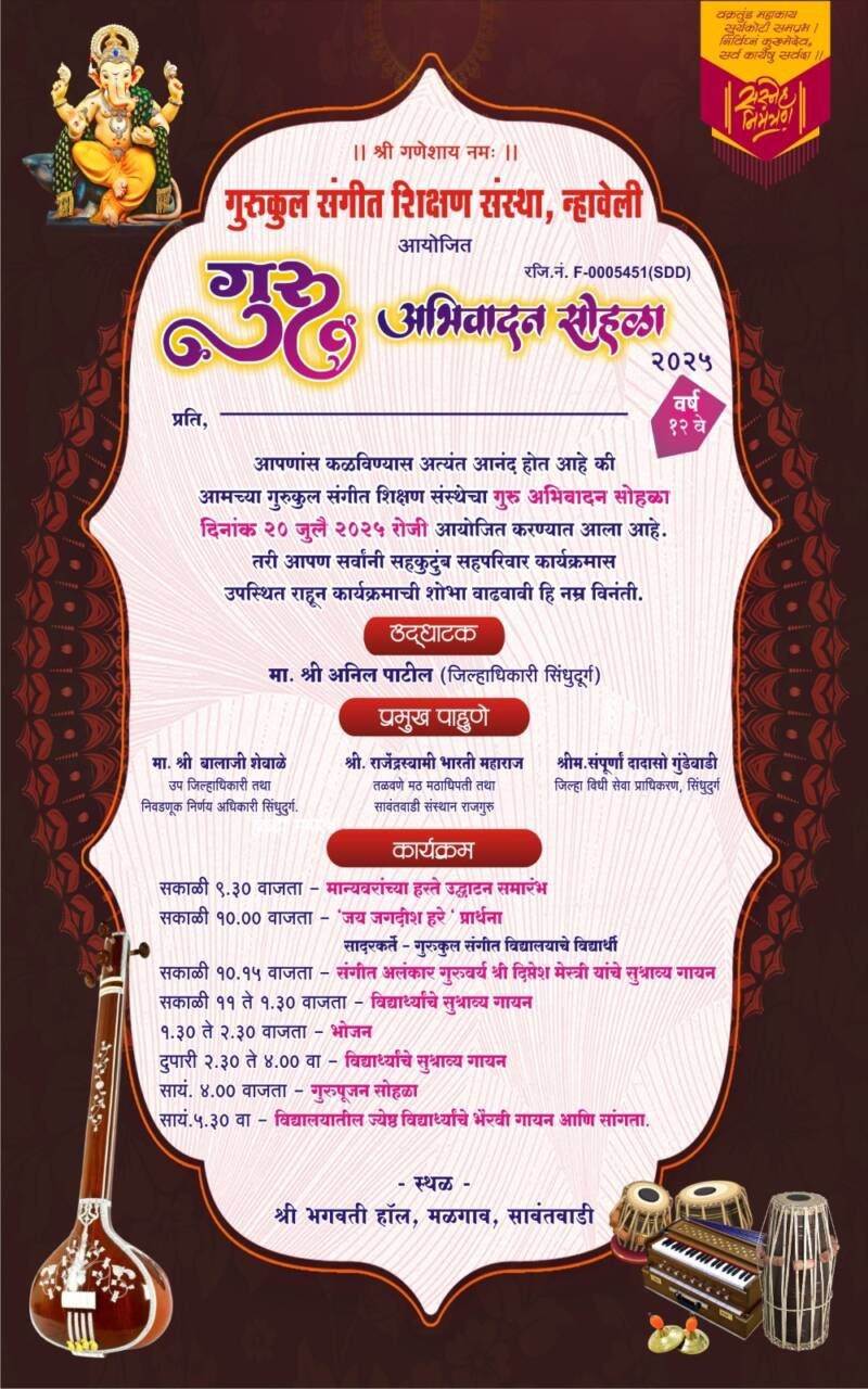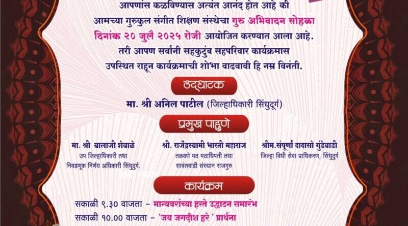 рдпрд╛ рдЧреБрд░реБ рдЕрднрд┐рд╡рд╛рджрди рд╕реЛрд╣рд│реНрдпрд╛рдЪреЗ рдЙрджрдШрд╛рдЯрди рд╕рдХрд╛рд│реА реп.рейреж рд╡рд╛рдЬрддрд╛ рдорд╛рдиреНрдпрд╡рд░рд╛рдВрдЪреНрдпрд╛ рд╣рд╕реНрддреЗ рд╣реЛрдгрд╛рд░ рдЖрд╣реЗ. рдпрд╛рд╡реЗрд│реА рдЙрджрдШрд╛рдЯрдХ рдЬрд┐рд▓реНрд╣рд╛рдзрд┐рдХрд╛рд░реА рдЕрдирд┐рд▓ рдкрд╛рдЯреАрд▓ рддрд░ рдкреНрд░рдореБрдЦ рдкрд╛рд╣реБрдгреЗ рдореНрд╣рдгреВрди рдЙрдк рдЬрд┐рд▓реНрд╣рд╛рдзрд┐рдХрд╛рд░реА рддрдерд╛ рдирд┐рд╡рдбрдгреВрдХ рдирд┐рд░реНрдгрдп рдЕрдзрд┐рдХрд╛рд░реА рдмрд╛рд▓рд╛рдЬреА рд╢реЗрд╡рд╛рд│реЗ, рддрд│рд╡рдгреЗ рдордард╛рдзрд┐рдкрддреА рддрдерд╛ рд╕рд╛рд╡рдВрддрд╡рд╛рдбреА рд╕рдВрд╕реНрдерд╛рди рд░рд╛рдЬрдЧреБрд░реБ рд░рд╛рдЬреЗрдВрджреНрд░рд╕реНрд╡рд╛рдореА рднрд╛рд░рддреА рдорд╣рд╛рд░рд╛рдЬ, рдЬрд┐рд▓реНрд╣рд╛ рд╡рд┐рдзреА рд╕реЗрд╡рд╛ рдкреНрд░рд╛рдзрд┐рдХрд░рдгрдЪреНрдпрд╛ рд╕рдВрдкреВрд░реНрдгрд╛ рдЧреБрдВрдбреЗрд╡рд╛рдбреА рдЙрдкрд╕реНрдерд┐рдд рд░рд╛рд╣рдгрд╛рд░ рдЖрд╣реЗрдд. рдХрд╛рд░реНрдпрдХреНрд░рдорд╛рдЪреНрдпрд╛ рдЙрджрдШрд╛рдЯрдирд╛рдирдВрддрд░ рд╕рдХрд╛рд│реА резреж.режреж рд╡рд╛рдЬрддрд╛ рдЧреБрд░реБрдХреБрд▓ рд╕рдВрдЧреАрдд рд╢рд┐рдХреНрд╖рдг рд╕рдВрд╕реНрдереЗрдЪреЗ рд╡рд┐рджреНрдпрд╛рд░реНрдереА ‘рдЬрдп рдЬрдЧрджреАрд╢ рд╣рд░реЗ рдкреНрд░рд╛рд░реНрдердирд╛, рд╕рдХрд╛рд│реА резреж.резрел рд╡рд╛рдЬрддрд╛ рд╕рдВрдЧреАрдд рдЕрд▓рдВрдХрд╛рд░ рдЧреБрд░реБрд╡рд░реНрдп рд╢реНрд░реА рджрд┐рдкреНрддреЗрд╢ рдореЗрд╕реНрддреНрд░реА рдпрд╛рдВрдЪреЗ рд╕реБрд╢реНрд░рд╛рд╡реНрдп рдЧрд╛рдпрди, резрез рддреЗ рез.рейреж рд╡рд╛рдЬрддрд╛ рдЧреБрд░реБрдХреБрд▓ рд╕рдВрдЧреАрдд рд╢рд┐рдХреНрд╖рдг рд╕рдВрд╕реНрдереЗрдЪреНрдпрд╛ рд╡рд┐рджреНрдпрд╛рд░реНрдереНрдпрд╛рдВрдЪреЗ рд╕реБрд╢реНрд░рд╛рд╡реНрдп рдЧрд╛рдпрди, рез.рейреж рддреЗ реи.рейреж рд╡рд╛рдЬрддрд╛ рднреЛрдЬрди, реи.рейреж рддреЗ рек.режреж рд╡рд╛рдЬрддрд╛ рд╡рд┐рджреНрдпрд╛рд░реНрдереНрдпрд╛рдВрдЪреЗ рд╕реБрд╢реНрд░рд╛рд╡реНрдп рдЧрд╛рдпрди, рд╕рд╛рдпрдВрдХрд╛рд│реА рек.режреж рд╡рд╛рдЬрддрд╛ рдореБрдЦреНрдп рдХрд╛рд░реНрдпрдХреНрд░рдо рдЧреБрд░реБрдкреВрдЬрди рд╕реЛрд╣рд│рд╛, рел.рейреж рд╡рд╛рдЬрддрд╛ рд╡рд┐рджреНрдпрд╛рд▓рдпрд╛рддреАрд▓ рдЬреНрдпреЗрд╖реНрда рд╡рд┐рджреНрдпрд╛рд░реНрдереНрдпрд╛рдВрдЪреЗ рднреИрд░рд╡реА рдЧрд╛рдпрди рдЖрдгрд┐ рдХрд╛рд░реНрдпрдХреНрд░рдорд╛рдЪреА рд╕рд╛рдВрдЧрддрд╛ рд╣реЛрдгрд╛рд░ рдЖрд╣реЗ. рд╣рд┐рддрдЪрд┐рдВрддрдХрд╛рдВрдиреА рддрд╕реЗрдЪ рд╕рдВрд╕реНрдереЗрддреАрд▓ рд╡рд┐рджреНрдпрд╛рд░реНрдереНрдпрд╛рдВрдиреА рд╕рд╣рдХреБрдЯреБрдВрдм рд╕рд╣рдкрд░рд┐рд╡рд╛рд░ рдХрд╛рд░реНрдпрдХреНрд░рдорд╛рд╕ рдЙрдкрд╕реНрдерд┐рдд рд░рд╛рд╣реВрди рдХрд╛рд░реНрдпрдХреНрд░рдорд╛рдЪреА рд╢реЛрднрд╛ рд╡рд╛рдврд╡рд╛рд╡реА, рдЕрд╕реЗ рдЖрд╡рд╛рд╣рди рдЧреБрд░реБрдХреБрд▓ рд╢рд┐рдХреНрд╖рдг рд╕рдВрд╕реНрдереЗрдЪреНрдпрд╛рд╡рддреАрдиреЗ рдХрд░рдгреНрдпрд╛рдд рдЖрд▓реЗ рдЖрд╣реЗ.