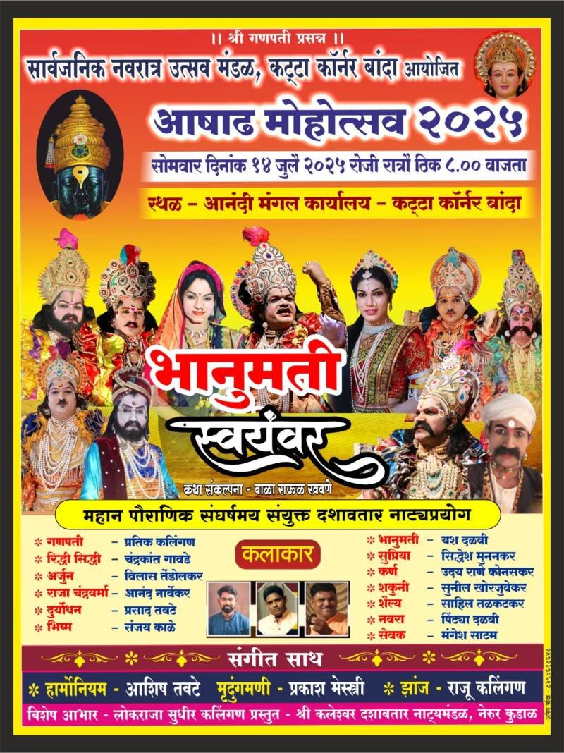 ЁЯЫСрд╕рд╛рд░реНрд╡рдЬрдирд┐рдХ рдирд╡рд░рд╛рддреНрд░ рдЙрддреНрд╕рд╡ рдордВрдбрд│ рдХрдЯреНрдЯрд╛ рдХреЙрд░реНрдирд░ рдмрд╛рдВрджрд╛ рдпреЗрдереЗ “рдЖрд╖рд╛рдв рдорд╣реЛрддреНрд╕рд╡ реирежреирел” рдирд┐рдорд┐рддреНрдд резрек рдЬреБрд▓реИ рд░реЛрдЬреА рдирд╛рдЯреНрдп рдкреНрд░рдпреЛрдЧрд╛рдЪреЗ рдЖрдпреЛрдЬрди.