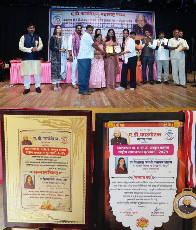 *ЁЯО┤рд╕рд┐рдВрдзреБрджреБрд░реНрдЧ, рджрд┐- реиреп:-* рджреЗрд╡рдЧрдб рддрд╛рд▓реБрдХреНрдпрд╛рддреАрд▓ рд╢рд┐рд░рдЧрд╛рд╡ рд╢реЗрд╡рд░реЗ рдпреЗрдереАрд▓ рдкреНрд░рд╛. рд╡рд┐рд╢рд╛рдЦрд╛ рдЬрдпрд╢реНрд░реА рдкреНрд░рднрд╛рдХрд░ рд╕рд╛рдЯрдо рд╣рд┐рд▓рд╛ рдП. рдбреА. рдлрд╛рдЙрдВрдбреЗрд╢рди рдорд╣рд╛рд░рд╛рд╖реНрдЯреНрд░ рд░рд╛рдЬреНрдп рдЖрдпреЛрдЬрд┐рдд рднрд╛рд░рддрд░рддреНрди рдбреЙ. рдП. рдкреА. рдЬреЗ. рдЕрдмреНрджреБрд▓ рдХрд▓рд╛рдо рд░рд╛рд╖реНрдЯреНрд░реАрдп рд╕рдорд╛рдЬ рд░рддреНрди рдЖрджрд░реНрд╢ рдкреНрд░рд╛рдзреНрдпрд╛рдкрд┐рдХрд╛ рдЪрд╛ 2025 рдЪрд╛ рдкреБрд░рд╕реНрдХрд╛рд░ рдЧ. рджрд┐ .рдорд╛рдбрдЧреВрд│рдХрд░ рдирд╛рдЯреНрдпрдЧреГрд╣ рдкрд┐рдВрдкрд░реА рдЪрд┐рдВрдЪрд╡рдб рдкреБрдгреЗ,рдпреЗрдереЗ рдП.рдбреА.рдлрд╛рдЙрдВрдбреЗрд╢рди рдорд╣рд╛рд░рд╛рд╖реНрдЯреНрд░ рд░рд╛рдЬреНрдп рдЖрдпреЛрдЬрд┐рдд рднрд╛рд░рддрд░рддреНрди рдбреЙ.рдП.рдкреА.рдЬреЗ рдЕрдмреНрджреБрд▓ рдХрд▓рд╛рдо рдЬреАрд╡рди рд╕рдорд╛рдЬрд░рддреНрди рдкреБрд░рд╕реНрдХрд╛рд░ рд╡рд┐рддрд░рдг рд╕реЛрд╣рд│рд╛ 2025 рдпрд╛ рдХрд╛рд░реНрдпрдХреНрд░рдорд╛рдд рджреЗрдгреНрдпрд╛рдд рдЖрд▓рд╛.