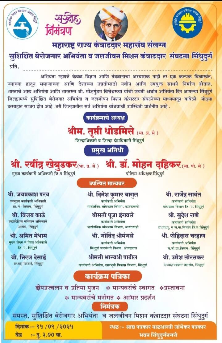 *ЁЯО┤рд╕рд┐рдВрдзреБрджреБрд░реНрдЧрдирдЧрд░реА, рджрд┐- резрел:-* рднрд╛рд░рддрд╛рдЪреЗ рдЖрджреНрдп рдЕрднрд┐рдпрдВрддрд╛ рд╡ рднрд╛рд░рддрд░рддреНрди рдореЛрдХреНрд╖рдЧреБрдВрдбрдо рд╡рд┐рд╢реНрд╡реЗрд╢реНрд╡рд░рдпреНрдпрд╛ рдпрд╛рдВрдЪреНрдпрд╛ рдЬрдпрдВрддреАрдирд┐рдорд┐рддреНрдд рдЕрднрд┐рдпрдВрддрд╛ рджрд┐рди рдореЛрдареНрдпрд╛ рдЙрддреНрд╕рд╛рд╣рд╛рдд рд╕рд╛рдЬрд░рд╛ рдХрд░рдгреНрдпрд╛рд╕рд╛рдареА рд╕реБрд╢рд┐рдХреНрд╖рд┐рдд рдмреЗрд░реЛрдЬрдЧрд╛рд░ рдЕрднрд┐рдпрдВрддрд╛ рд╡ рдЬрд▓рдЬреАрд╡рди рдорд┐рд╢рди рдХрдВрддреНрд░рд╛рдЯрджрд╛рд░ рд╕рдВрдШрдЯрдирд╛ рд╕рд┐рдВрдзреБрджреБрд░реНрдЧ (рдорд╣рд╛рд░рд╛рд╖реНрдЯреНрд░ рд░рд╛рдЬреНрдп рдХрдВрддреНрд░рд╛рдЯрджрд╛рд░ рдорд╣рд╛рд╕рдВрдШ рд╕рдВрд▓рдЧреНрди) рдпрд╛рдВрдЪреНрдпрд╛рддрд░реНрдлреЗ рднрд╡реНрдп рдХрд╛рд░реНрдпрдХреНрд░рдорд╛рдЪреЗ рдЖрдпреЛрдЬрди рдХрд░рдгреНрдпрд╛рдд рдЖрд▓реЗ рдЖрд╣реЗ.