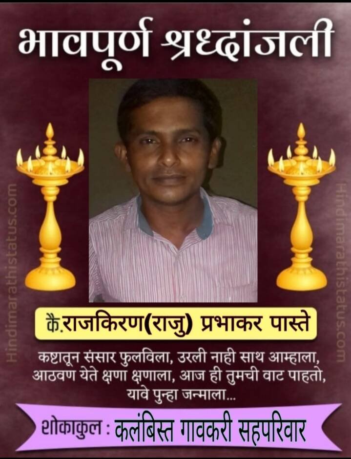 *ЁЯО┤рд╕рд╛рд╡рдВрддрд╡рд╛рдбреА, рджрд┐- резрем:-* рд╕рд╛рд╡рдВрддрд╡рд╛рдбреА рддрд╛рд▓реБрдХреНрдпрд╛рддреАрд▓ рдХрд▓рдВрдмрд┐рд╕реНрдд рдЧрд╛рд╡рдЪреЗ рд░рд╣рд┐рд╡рд╛рд╢реА рд╢реНрд░реА. рд░рд╛рдЬрдХрд┐рд░рдг (рд░рд╛рдЬреБ) рдкреНрд░рднрд╛рдХрд░ рдкрд╛рд╕реНрддреЗ рдпрд╛рдВрдЪреЗ рдЖрдЬ рд╕рдХрд╛рд│реА рд╣реГрджрдпрд╡рд┐рдХрд╛рд░рд╛рдЪреНрдпрд╛ рдзрдХреНрдХреНрдпрд╛рдиреЗ рдЕрдХрд╕реНрдорд╛рдд рдирд┐рдзрди рдЭрд╛рд▓реЗ. рдирд┐рдзрдирд╕рдордпреА рддреНрдпрд╛рдВрдЪреЗ рд╡рдп рдЕрдВрджрд╛рдЬреЗ релреж рд╡рд░реНрд╖реЗ рд╣реЛрддреЗ.