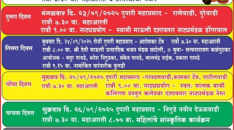 реирей рд╕рдкреНрдЯреЗрдВрдмрд░ рд░реЛрдЬреА рд╕реНрд╡рд╛рдореА рдорд╛рдКрд▓реА рджрд╢рд╛рд╡рддрд╛рд░ рдирд╛рдЯреНрдпрдордВрдбрд│ (рдбреЛрдВрдЧрд░рдкрд╛рд▓) рдпрд╛рдВрдЪрд╛ рдирд╛рдЯреНрдпрдкреНрд░рдпреЛрдЧ рд╣реЛрдгрд╛рд░ рдЖрд╣реЗ.реирек рд╕рдкреНрдЯреЗрдВрдмрд░ рд░реЛрдЬреА рд╢реНрд░реА рджреЗрд╡реА рдорд╛рдКрд▓реА рдкреНрд░рд╛рд╕рд╛рджрд┐рдХ рднрдЬрди рдордВрдбрд│ (рд╕рд╛рдЯреЗрд▓реА) рдпрд╛рдВрдЪреЗ рднрдЬрди рдЖрдгрд┐ рдкрд╛рд░рдВрдкрд░рд┐рдХ рдлреБрдЧрдбреА рдХрд╛рд░реНрдпрдХреНрд░рдо рд░рдВрдЧрдгрд╛рд░ рдЖрд╣реЗрдд.реирел рд╕рдкреНрдЯреЗрдВрдмрд░ рд░реЛрдЬреА рд╕реНрд╡рддрдГ рдорд╛рд▓рдХ рдмрд╛рдмреА рдпрд╛рдВрдЪрд╛ рдирд╛рдЯреНрдпрдкреНрд░рдпреЛрдЧ рд╣реЛрдИрд▓.реирем рд╕рдкреНрдЯреЗрдВрдмрд░ рд░реЛрдЬреА рдорд╣рд┐рд▓рд╛рдВрдЪреНрдпрд╛ рд╕рд╛рдВрд╕реНрдХреГрддрд┐рдХ рдХрд╛рд░реНрдпрдХреНрд░рдорд╛рдВрдЪреА рдореЗрдЬрд╡рд╛рдиреА рдЕрд╕реЗрд▓.