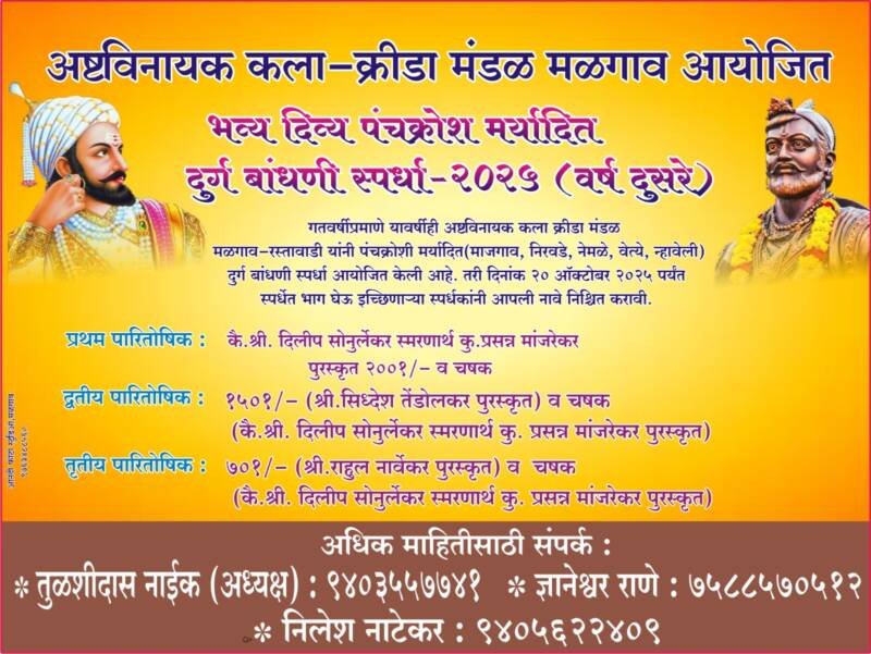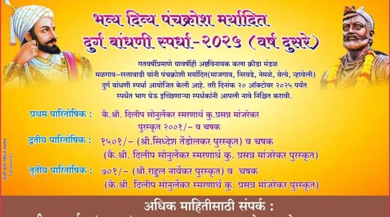 рд╕реНрдкрд░реНрдзреЗрддреАрд▓ рдЧреБрдгрд╛рдВрдЪреЗ рджреБрд░реНрдЧ рдмрд╛рдВрдзрдгреА, рджреБрд░реНрдЧрд╛рдЪреЗ рдРрддрд┐рд╣рд╛рд╕рд┐рдХ рдорд╣рддреНрддреНрд╡, рджреБрд░реНрдЧрд╛рдЪреА рд╕рдЬрд╛рд╡рдЯ, рдЗрдВрд╕реНрдЯрд╛рдЧреНрд░рд╛рдо рд╡реНрд╣рд┐рдбрд┐рдУрд▓рд╛ рдорд┐рд│рд╛рд▓реЗрд▓реЗ рд▓рд╛рдЗрдХреНрд╕ рдЕрд╕реЗ рдЧреБрдгрд╛рдВрдЪреЗ рд╡рд┐рднрд╛рдЬрди рдХрд░рдгреНрдпрд╛рдд рдпреЗрдгрд╛рд░ рдЖрд╣реЗ. рд╕реНрдкрд░реНрдзрдХрд╛рдВрдиреА рдмрд╛рдВрдзрд▓реЗрд▓реНрдпрд╛ рджреБрд░реНрдЧрд╛рдЪреЗ рдкрд░реАрдХреНрд╖рдг рдСрдирд▓рд╛рдИрди рдкрджреНрдзрддреАрдиреЗ рд╣реЛрдИрд▓. рд╕реНрдкрд░реНрдзреЗрдд рднрд╛рдЧ рдШреЗрдК рдЗрдЪреНрдЫрд┐рдгрд╛рд▒реНрдпрд╛ рдЗрдЪреНрдЫреВрдХ рд╕реНрдкрд░реНрдзрдХрд╛рдВрдиреА реиреж рдСрдХреНрдЯреЛрдмрд░рдкрд░реНрдпрдВрдд рдордВрдбрд│рд╛рдЪреНрдпрд╛ рдХрд╛рд░реНрдпрдХрд░реНрддреНрдпрд╛рдВрд╢реА рд╕рдВрдкрд░реНрдХ рд╕рд╛рдзреВрди рдЖрдкрд▓реА рдирд╛рд╡реЗ рдирд┐рд╢реНрдЪрд┐рдд рдХрд░рд╛рд╡реА. рдЕрдзрд┐рдХ рдорд╛рд╣рд┐рддреАрд╕рд╛рдареА рдЕрд╖реНрдЯрд╡рд┐рдирд╛рдпрдХ рдХрд▓рд╛-рдХреНрд░реАрдбрд╛ рдордВрдбрд▓рд╛рдЪреЗ рдЕрдзреНрдпрдХреНрд╖ рддреБрд│рд╢реАрджрд╛рд╕ рдирд╛рдИрдХ-репрекрежрейрелрелренренрекрез, рдЬреНрдЮрд╛рдиреЗрд╢реНрд╡рд░ рд░рд╛рдгреЗ-ренрелреореорелренрежрелрезреи- рдирд┐рд▓реЗрд╢ рдирд╛рдЯреЗрдХрд░-репрекрежрелремреиреирекрежреп рдпрд╛рдВрдЪреНрдпрд╛рд╢реА рд╕рдВрдкрд░реНрдХ рд╕рд╛рдзрд╛рд╡рд╛. рдЬрд╛рд╕реНрддреАрдд рдЬрд╛рд╕реНрдд рд╕реНрдкрд░реНрдзрдХрд╛рдВрдиреА рд╕реНрдкрд░реНрдзреЗрдд рднрд╛рдЧ рдШреНрдпрд╛рд╡рд╛, рдЕрд╕реЗ рдЖрд╡рд╛рд╣рди рдЕрд╖реНрдЯрд╡рд┐рдирд╛рдпрдХ рдХрд▓рд╛-рдХреНрд░реАрдбрд╛ рдордВрдбрд│рд╛рдЪреНрдпрд╛ рд╡рддреАрдиреЗ рдХрд░рдгреНрдпрд╛рдд рдЖрд▓реЗ рдЖрд╣реЗ.