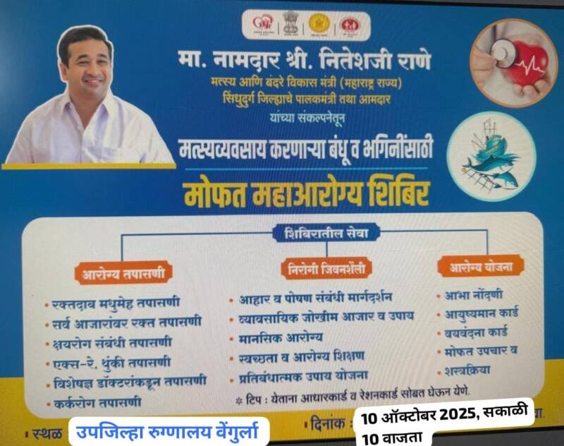 *ЁЯО┤рд╕рд╛рд╡рдВрддрд╡рд╛рдбреА, рджрд┐- режрен:-* рдорд╛рдирдиреАрдп рдирд╛рдорджрд╛рд░ рдирд┐рддреЗрд╢рдЬреА рд░рд╛рдгреЗ, рдкрд╛рд▓рдХрдордВрддреНрд░реА рд╕рд┐рдВрдзреБрджреБрд░реНрдЧ рддрдерд╛ рдорддреНрд╕реНрдпрд╡реНрдпрд╡рд╕рд╛рдп рдордВрддреНрд░реА рдпрд╛рдВрдЪреЗ рдорд╛рд░реНрдЧрджрд░реНрд╢рдирд╛рдЦрд╛рд▓реА рд╡ рдЬрд┐рд▓реНрд╣рд╛ рд╢рд▓реНрдп рдЪрд┐рдХрд┐рддреНрд╕рдХ рд╕рд┐рдВрдзреБрджреБрд░реНрдЧ рдпрд╛рдВрдЪреНрдпрд╛ рдорд╛рд░реНрдлрдд рдЙрдк рдЬрд┐рд▓реНрд╣рд╛ рд░реБрдЧреНрдгрд╛рд▓рдп рд╡реЗрдВрдЧреБрд░реНрд▓рд╛ рдпреЗрдереЗ рд╢реБрдХреНрд░рд╡рд╛рд░ рджрд┐рдирд╛рдВрдХ резреж рдСрдХреНрдЯреЛрдмрд░ рд░реЛрдЬреА рдордЪреНрдЫреАрдорд╛рд░ рд╕рдорд╛рдЬрд╛рд╕рд╛рдареА рдореЛрдлрдд рд╡реИрджреНрдпрдХреАрдп рддрдкрд╛рд╕рдгреА рд╡ рдЖрд░реЛрдЧреНрдп рд╢рд┐рдмрд┐рд░ рд╕рдХрд╛рд│реА резреж рддреЗ рд╕рд╛рдпрдВрдХрд╛рд│реА рел рдпрд╛ рд╡реЗрд│реЗрдд рдЖрдпреЛрдЬрд┐рдд рдХреЗрд▓реЗ рдЖрд╣реЗ.