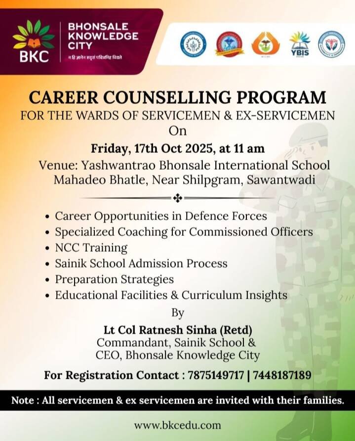 *ЁЯО┤рд╕рд╛рд╡рдВрддрд╡рд╛рдбреА, рджрд┐- резрел:-* рднреЛрд╕рд▓реЗ рдиреЙрд▓реЗрдЬ рд╕рд┐рдЯреА рддрд░реНрдлреЗ рдЖрдЬреА-рдорд╛рдЬреА рд╕реИрдирд┐рдХрд╛рдВрдЪреНрдпрд╛ рдкрд╛рд▓реНрдпрд╛рдВрд╕рд╛рдареА рд╢реБрдХреНрд░рд╡рд╛рд░, рджрд┐.резрен рдСрдХреНрдЯреЛрдмрд░ рд░реЛрдЬреА рд╡рд┐рд╢реЗрд╖ рдХрд░рд┐рдЕрд░ рдХреМрдиреНрд╕рд┐рд▓рд┐рдВрдЧ рдХрд╛рд░реНрдпрдХреНрд░рдо рдЖрдпреЛрдЬрд┐рдд рдХрд░рдгреНрдпрд╛рдд рдЖрд▓рд╛ рдЖрд╣реЗ. рд╣рд╛ рдХрд╛рд░реНрдпрдХреНрд░рдо рд╕рдХрд╛рд│реА резрез рд╡рд╛рдЬрддрд╛ рдпрд╢рд╡рдВрддрд░рд╛рд╡ рднреЛрд╕рд▓реЗ рдЗрдВрдЯрд░рдиреЕрд╢рдирд▓ рд╕реНрдХреВрд▓рдЪреНрдпрд╛ рд╕рднрд╛рдЧреГрд╣рд╛рдд рд╕рдВрдкрдиреНрди рд╣реЛрдИрд▓.